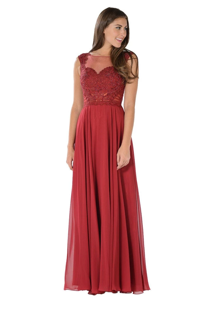 Look radiant in this long A-line black chiffon gown with illusion lace applique bodice by Poly USA 7604. This long evening dress features a sleeveless illusion bodice decorated with intricate lace appliques accented with beads. An embellished sheer back, flowing floor-length skirt, and a zipper closure complete this beautiful look. Affordably priced under $200, this dress is perfect for any formal event and will keep you on budget!