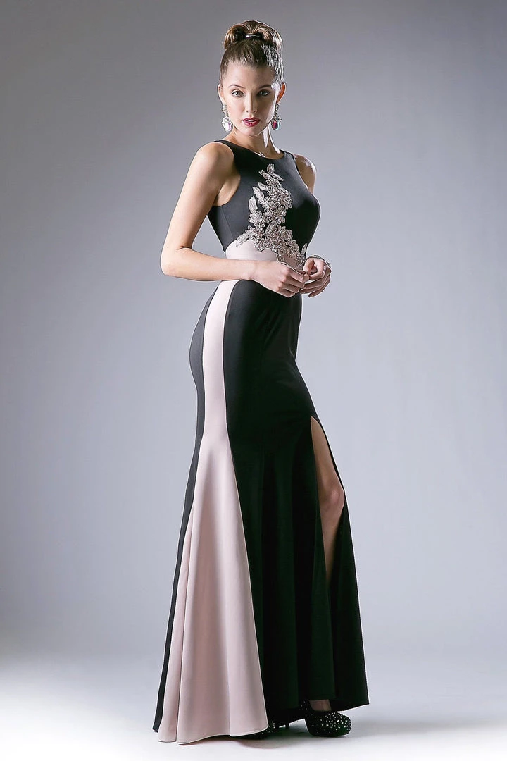 Dazzle the room in this fitted long black sleeveless dress with slit by Cinderella Divine CF126.