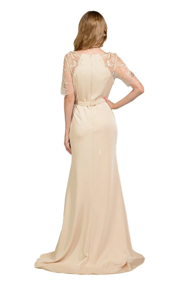 Look chic yet modest in this cobalt blue satin gown with embellished sheer mid-sleeves by Poly USA 7736. This long evening dress features a lovely embroidered sheer mid-sleeves accented with beads and a solid waistband. An eye-catching embellished back, a full-length skirt with short train, and a zipper closure complete this beautiful look. Perfect as a mother of the bride dress or for any formal event!