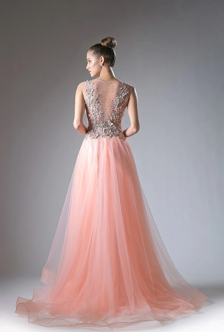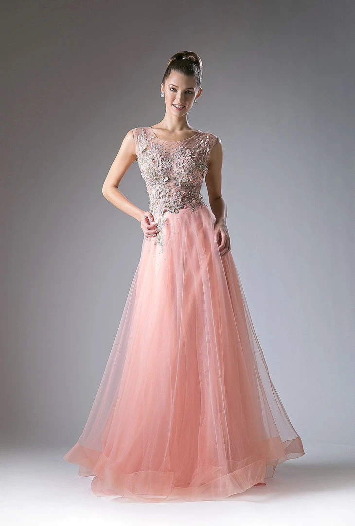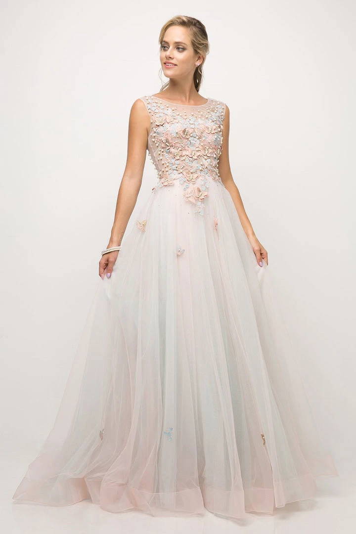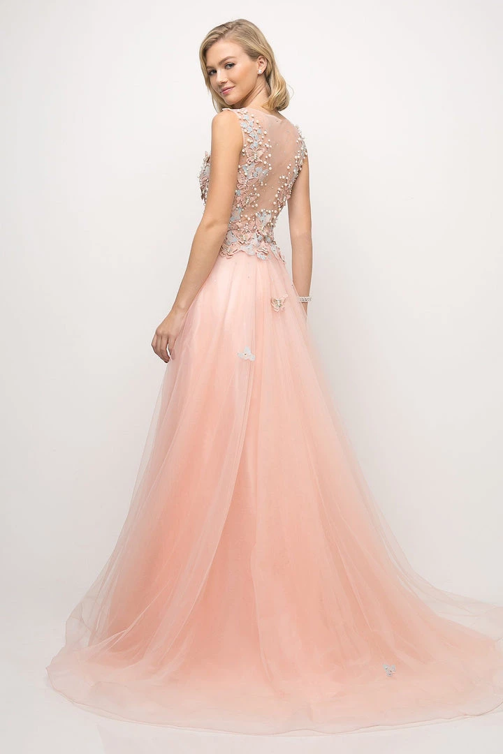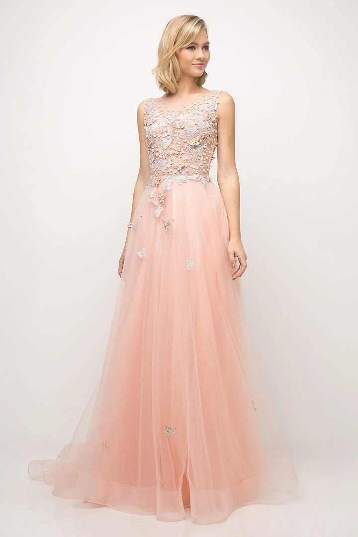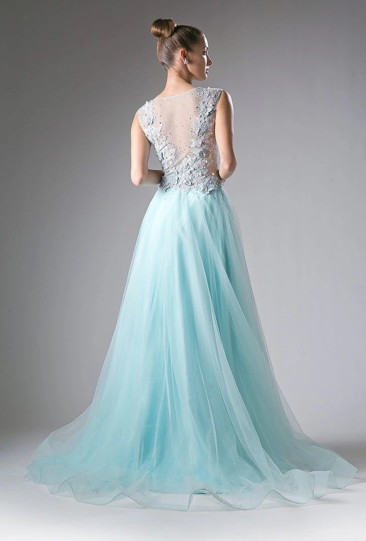 Be the center of attention in this long illusion tulle A-line dress with bead embellished bodice by Cinderella Divine 1652. We love this beautiful A-line tulle dress with 3D floral appliques and illusion back!