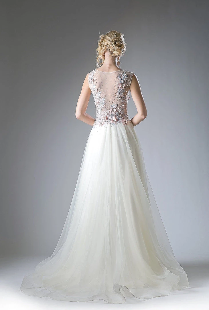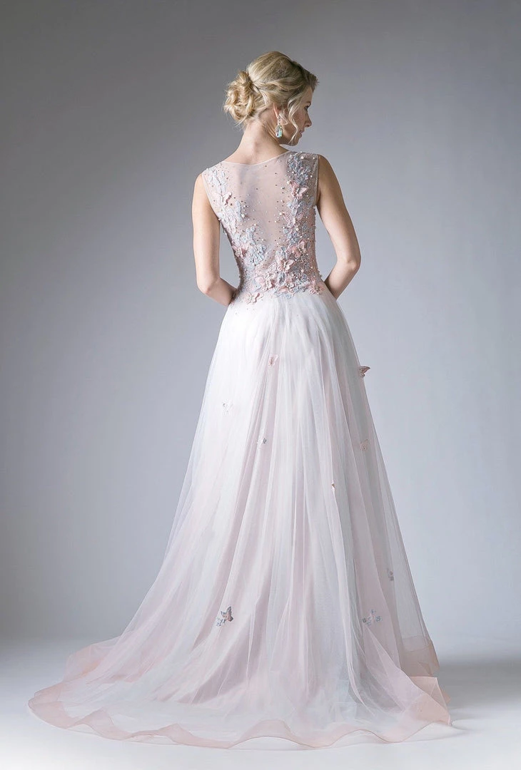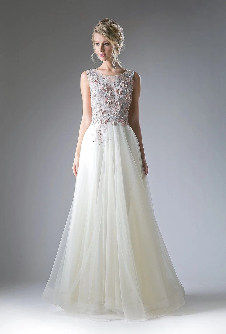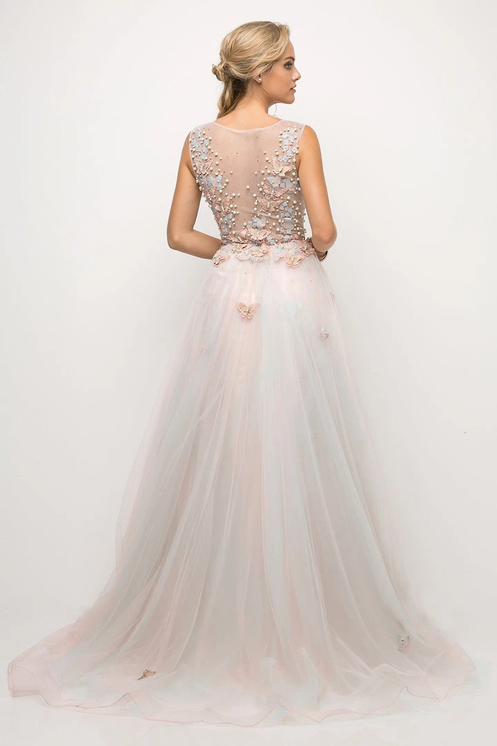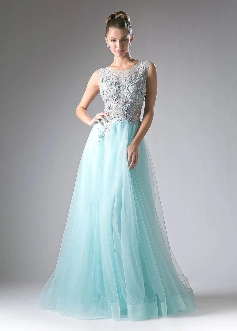Be the center of attention in this long illusion tulle A-line dress with bead embellished bodice by Cinderella Divine 1652. We love this beautiful A-line tulle dress with 3D floral appliques and illusion back!