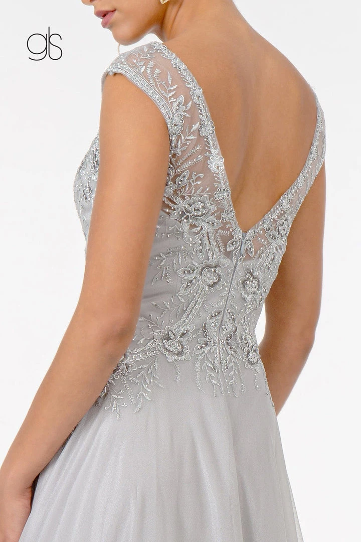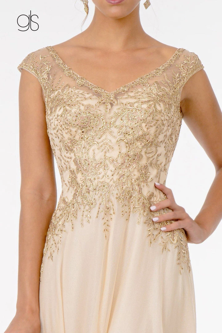 Enjoy your evening in this long cap sleeve dress with embroidered illusion bodice by Elizabeth K GL1826.