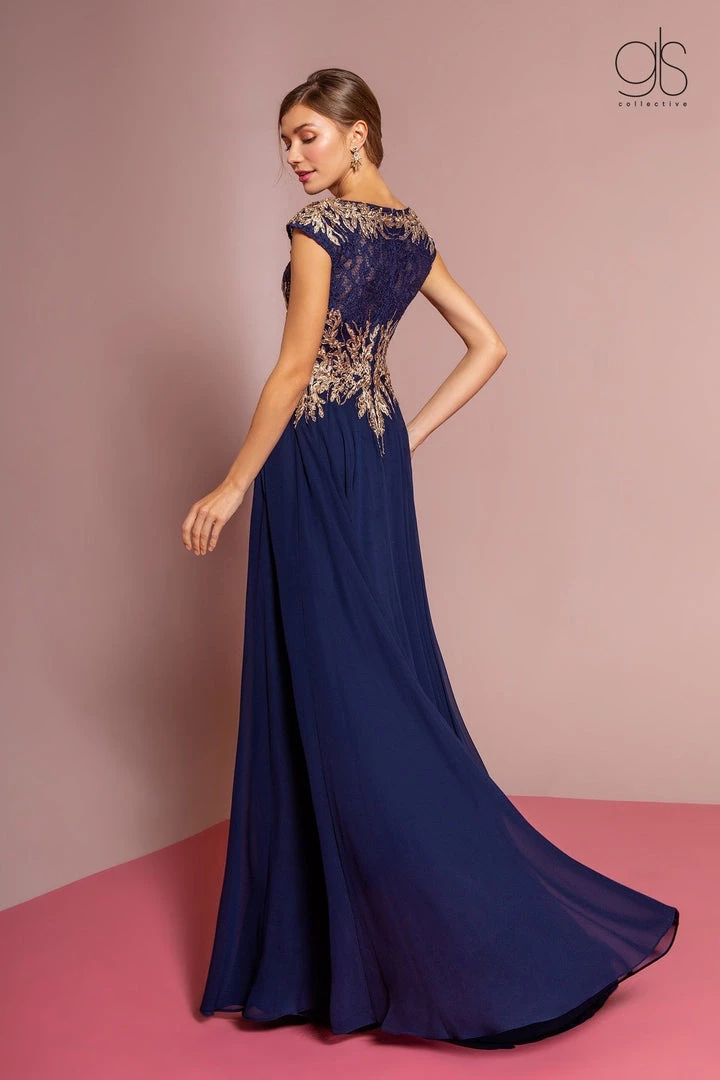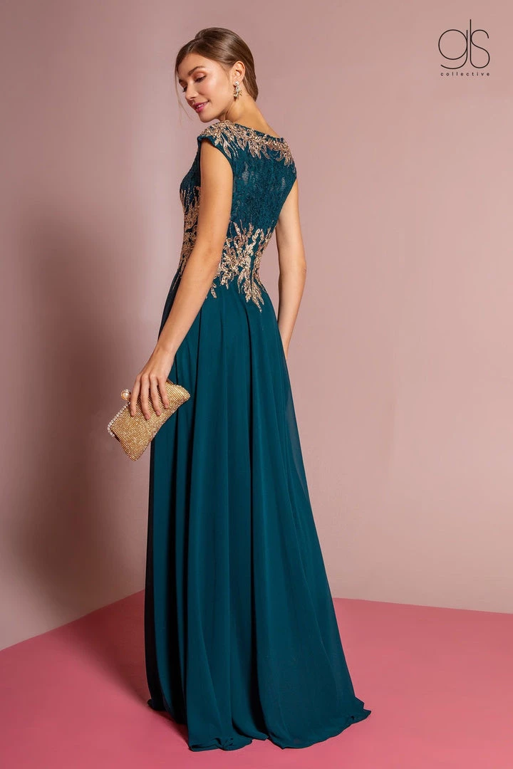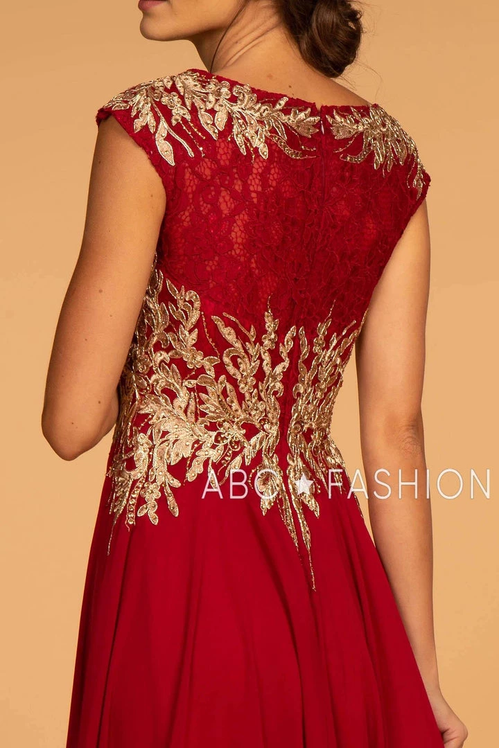 Look modest chic in this cap sleeve embroidered gown with lace bodice by Elizabeth K GL2519. This long evening dress features a lace bodice with cap sleeves, beautiful gold embroidery adorns the boat neckline and cascades to the waistline, a floor length A-line chiffon skirt, and a zipper closure. Affordably priced under $300, this dress is perfect for any formal event and will keep you on budget!