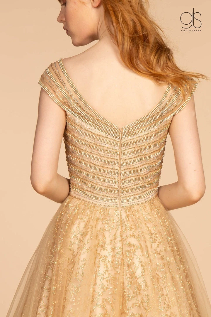 - Jewel Embellished Bodice and Glitter Print Skirt Long Dress