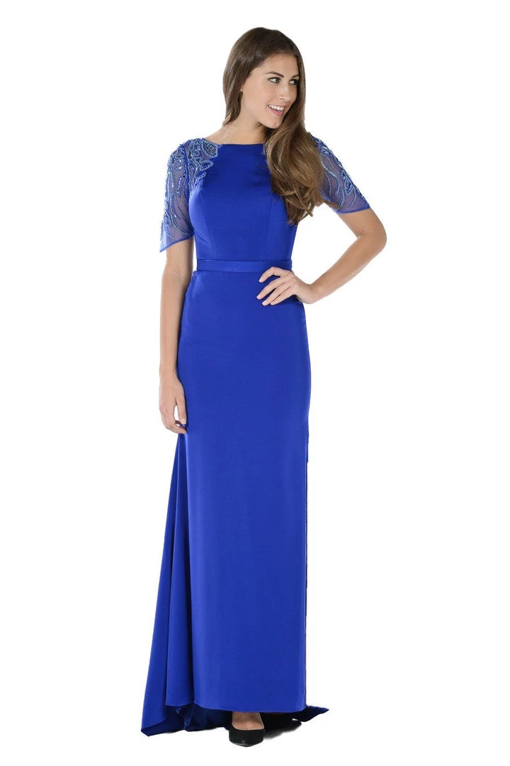 Look chic yet modest in this champagne satin gown with embellished sheer mid-sleeves by Poly USA 7736. This long evening dress features a lovely embroidered sheer mid-sleeves accented with beads and a solid waistband. An eye-catching embellished back, a full-length skirt with short train, and a zipper closure complete this beautiful look. Perfect as a mother of the bride dress or for any formal event!