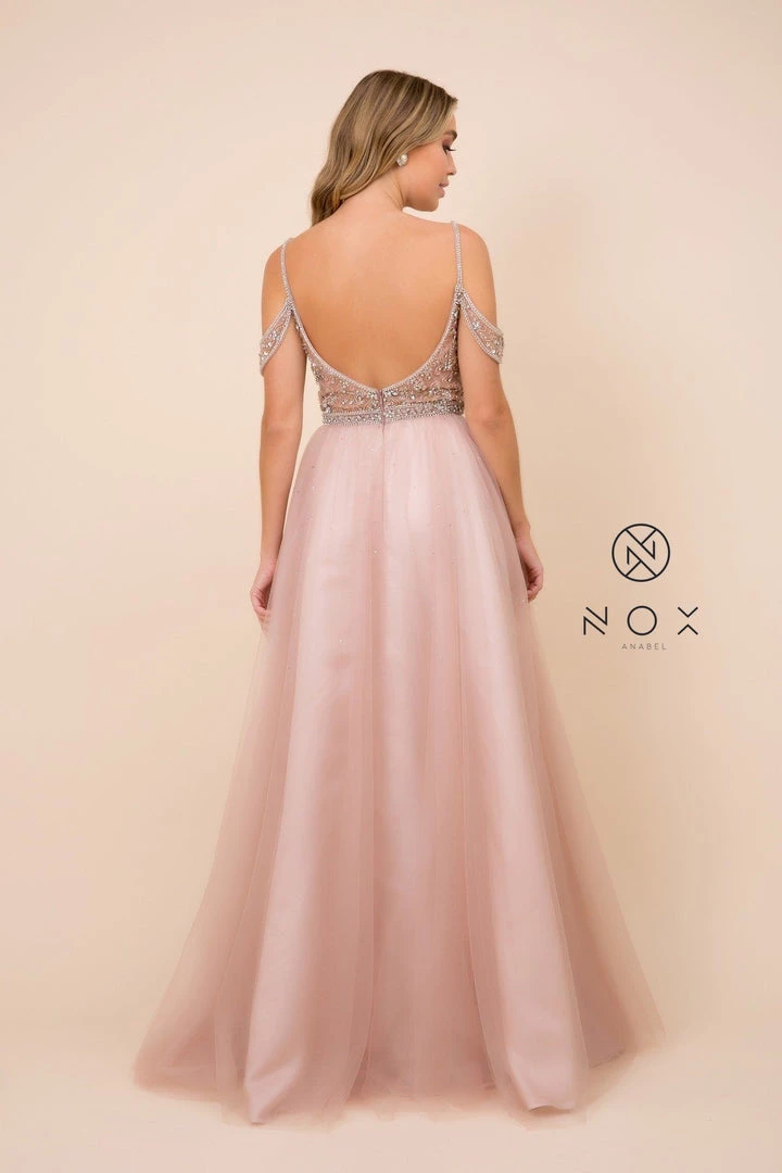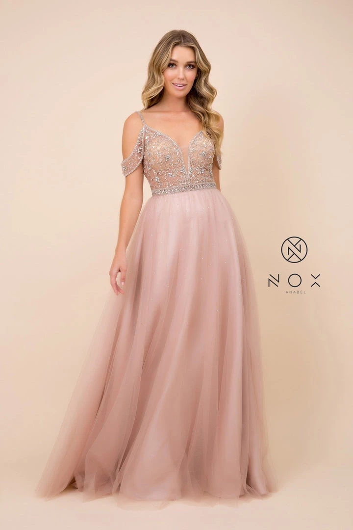 Captivate the room in this long cold shoulder glitter tulle dress with beaded bodice by Nox Anabel L342.