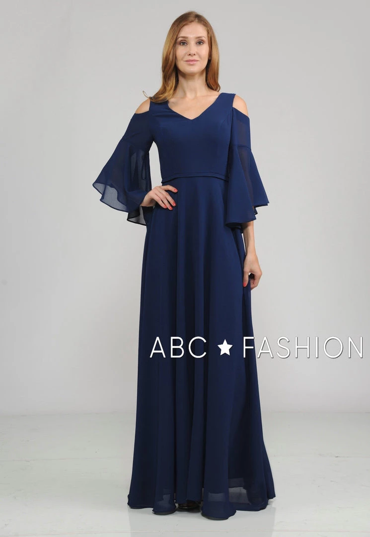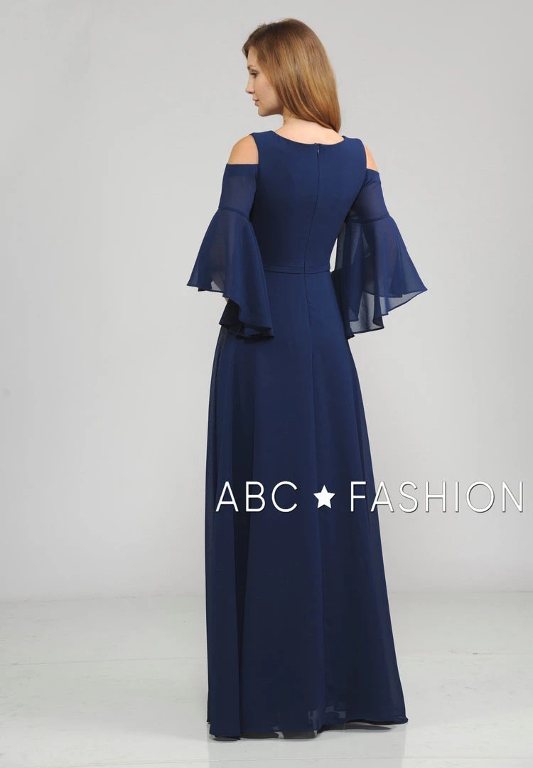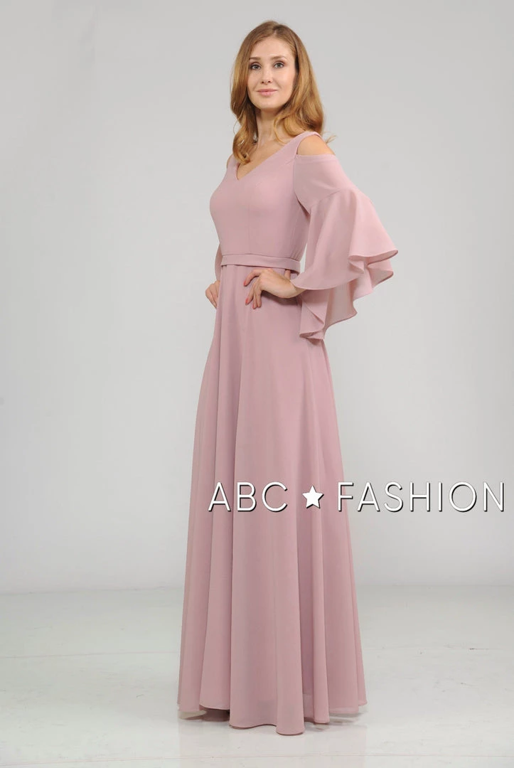 Look modest chic in this cold shoulder V-neck gown with bell sleeves by Poly USA 8300. Elegant Pebble Georgette long dress with V-neckline, cold shoulder, bell sleeves, and a back center zipper closure. Affordably priced under $130, this dress is perfect for any formal event and will keep you on budget!