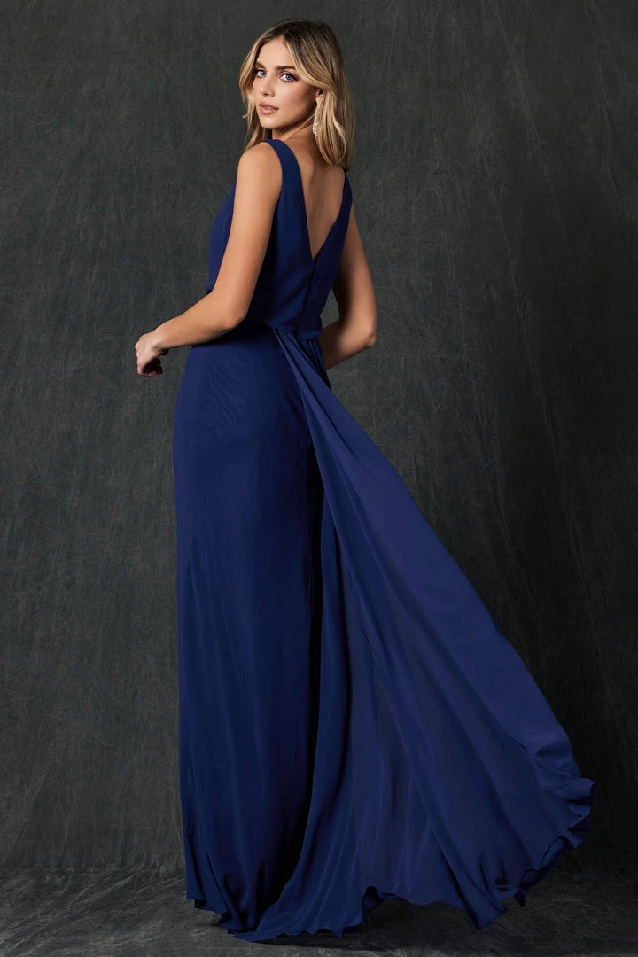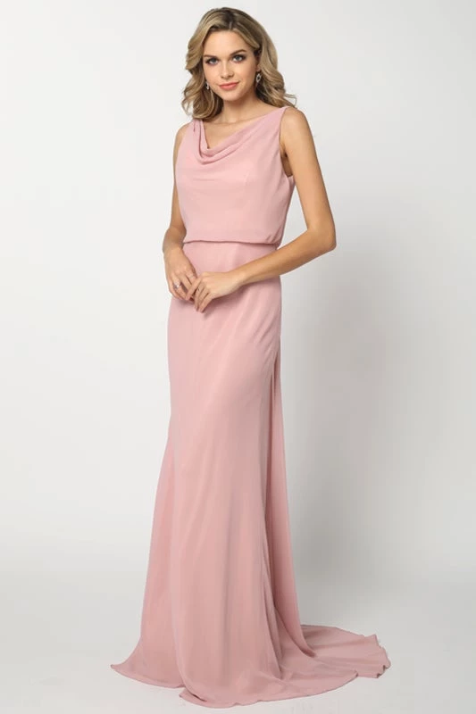 Make an elegant entrance in this sleeveless fitted long cowl neck chiffon dress with a flowing sweep train by Juliet 670.