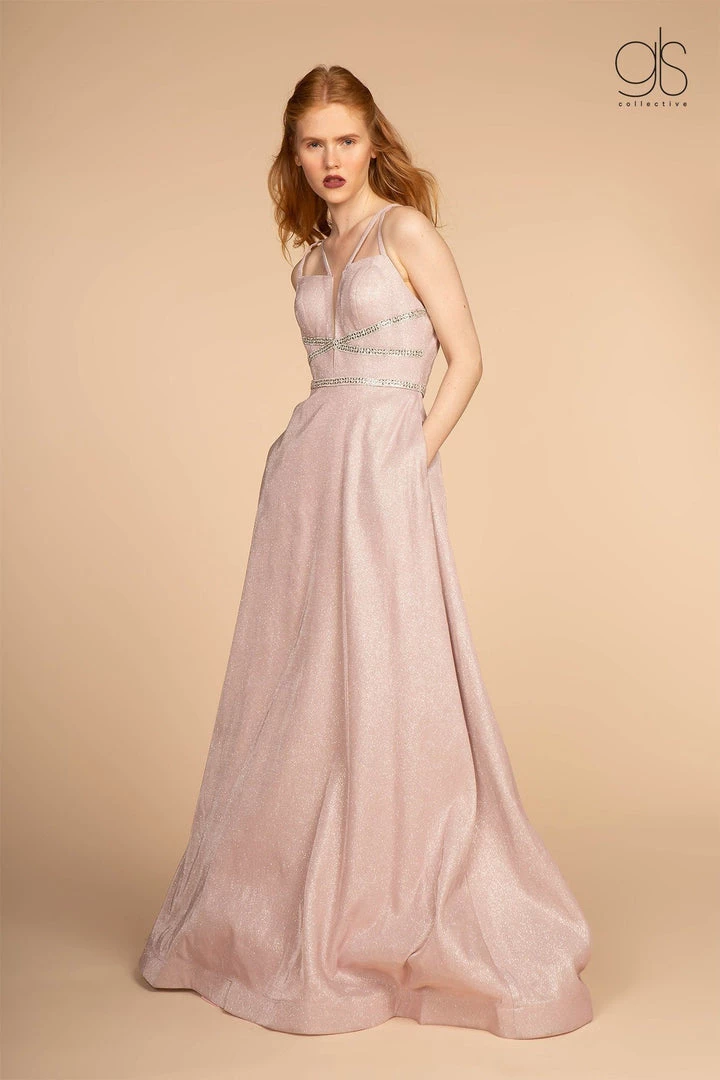 Command attention in this glitter V-neck gown with side pockets by Elizabeth K.