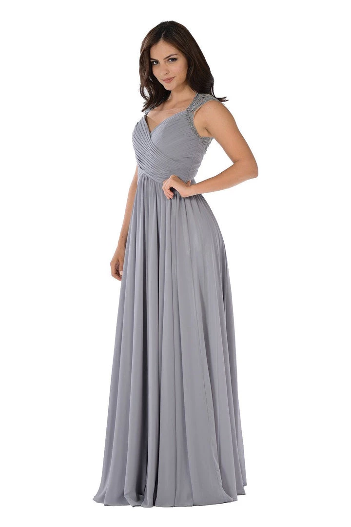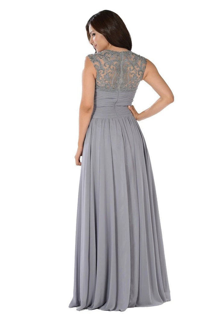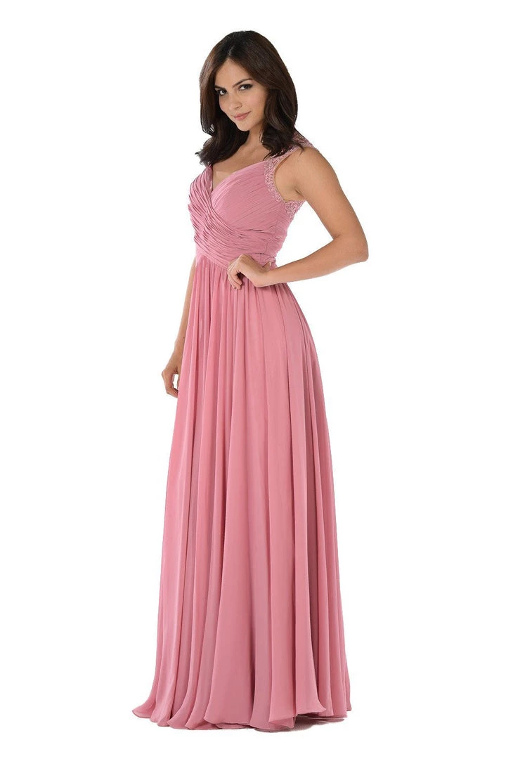 Look sophisticated in this long dusty rose chiffon dress with pleated V-neck bodice by Poly USA 7602. This long evening dress features a sleeveless bodice decorated with side lace embroidery. An eye-catching sheer lace appliqued back, a full-length chiffon skirt, and a zipper closure complete this beautiful look. Affordably priced under $200, this dress is perfect for any formal event and will keep you on budget!