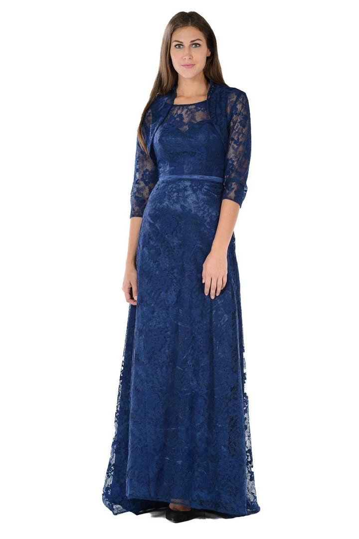 Look chic yet modest in this dusty rose lace gown with lace bolero jacket by Poly USA 7774. This long evening dress features a sleeveless lace illusion bodice with a thin satin waistband. An elegant lace bolero jacket, V-shaped open back, a full-length skirt, and a zipper closure complete this beautiful look. Perfect as a mother of the bride dress or for any formal event!