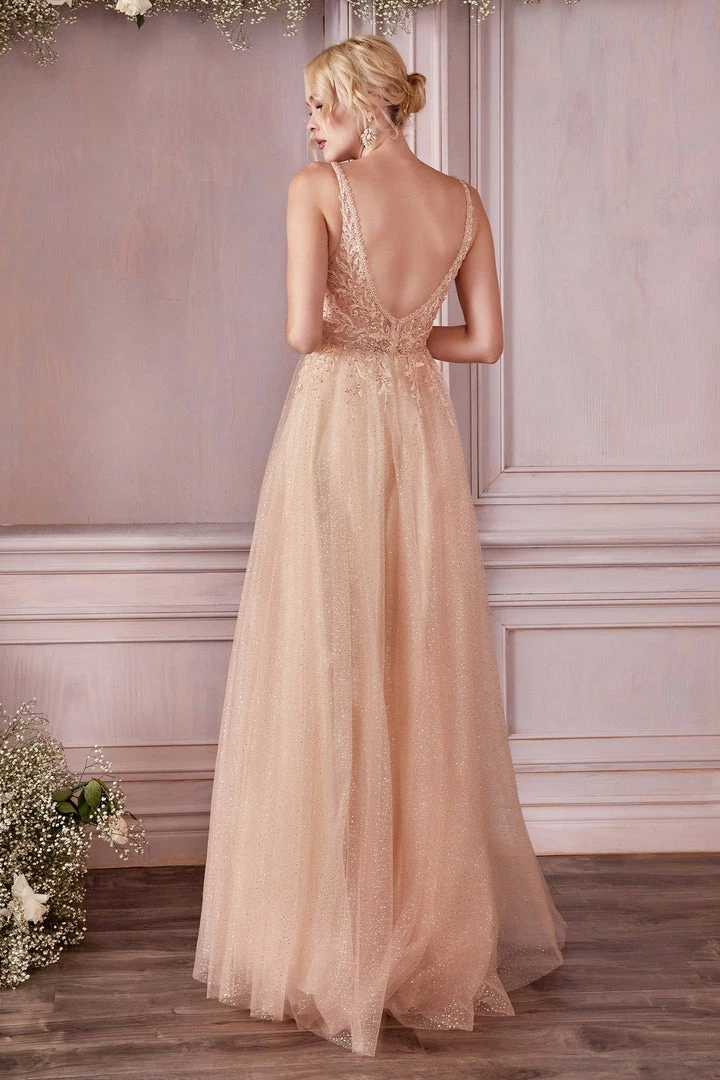 Dance the night away in this lace applique long tulle dress with A-line skirt by Cinderella Divine CD0196. This whimsical A-line gown is cut from layered tulle and is embellished with beaded lace appliques. This fairy tale gown has a V-neckline and open swoop back.