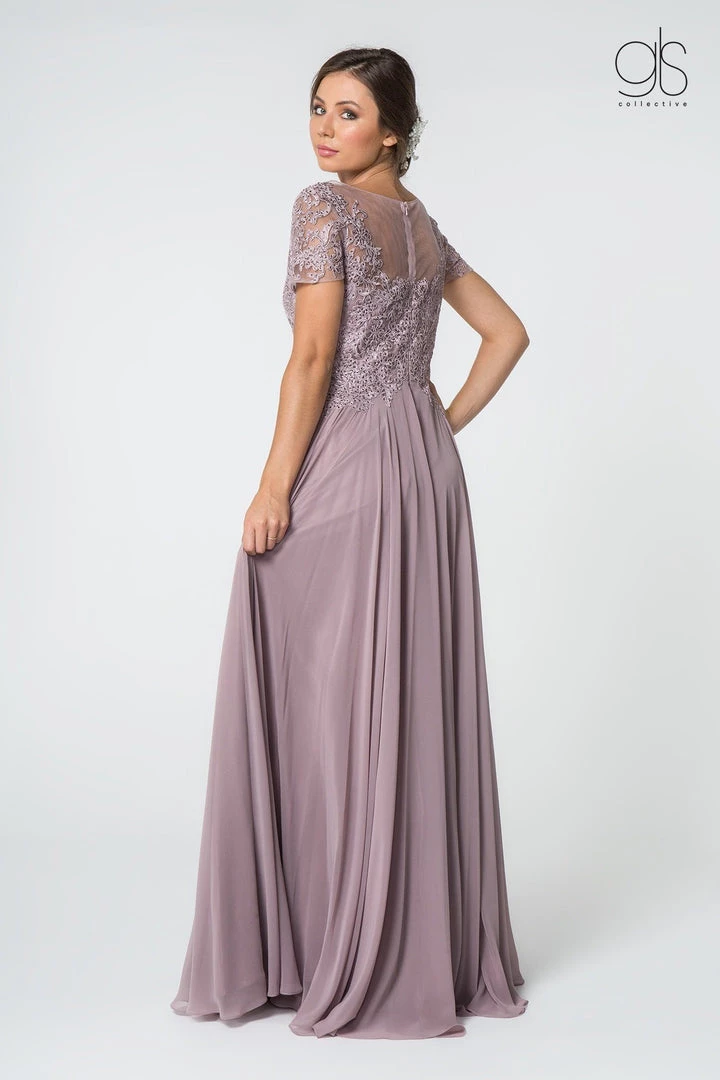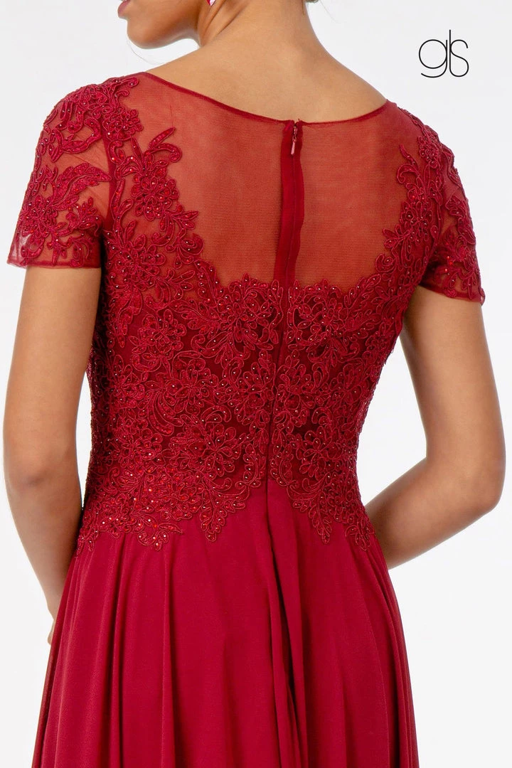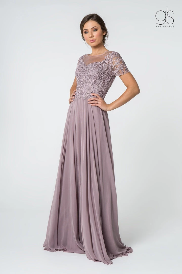 Look timeless in this short-sleeve long gown withĀ embroidered illusion bodice by Elizabeth K GL2813.