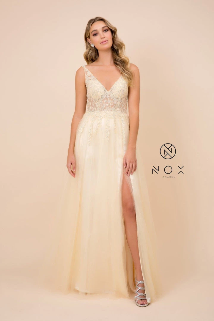 Look unforgettable in this long tulle V-neck dress with bead embroidered bodice by Nox Anabel G390. This evening gown features a sleeveless V-neck sheer bodice adorned with embroidery that’s accented with rhinestones, spaghetti straps, illusion open V-back, a floor length A-line skirt with a side leg slit, and a zipper closure.
