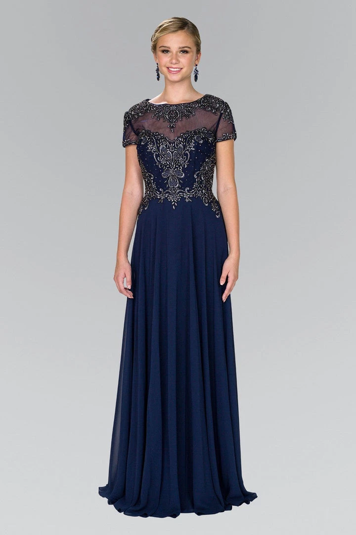 Light up the room in this bead embroidered long chiffon dress with short sleeves by Elizabeth K GL2406. This long evening gown features a bateau neckline, sheer short-sleeved bodice with beautiful beaded embroidery, sheer embellished back, full length skirt that elegantly flows to the floor, and a zipper closure. Perfect as a Mother of the Bride dress or for any formal event!