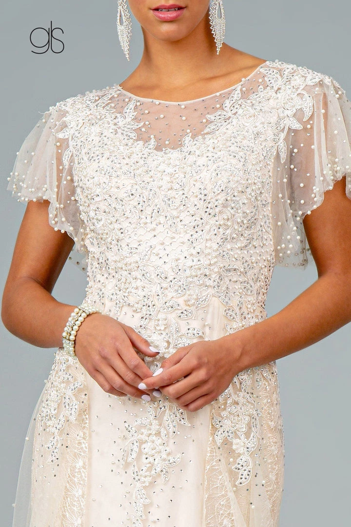 Look modest chic in this long embroidered lace dress with short sleeves by Elizabeth K GL2881.