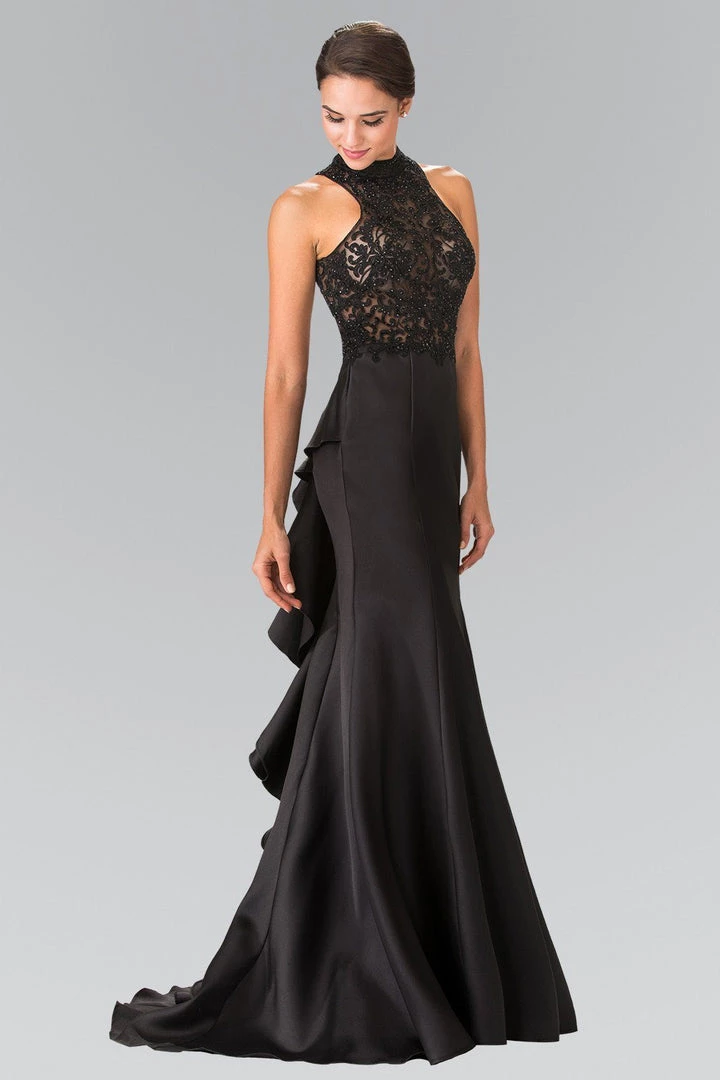 All eyes will be on you in this long high neck embroidered illusion dress with ruffled back by Elizabeth K.