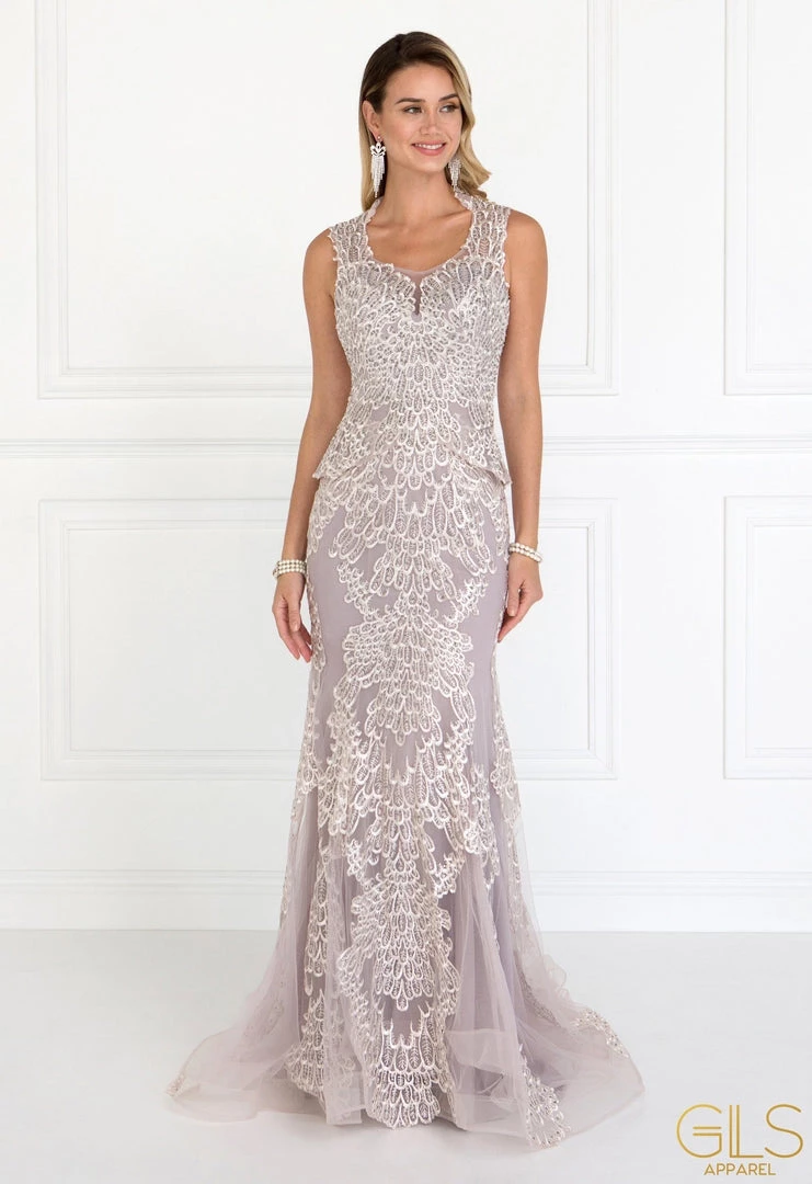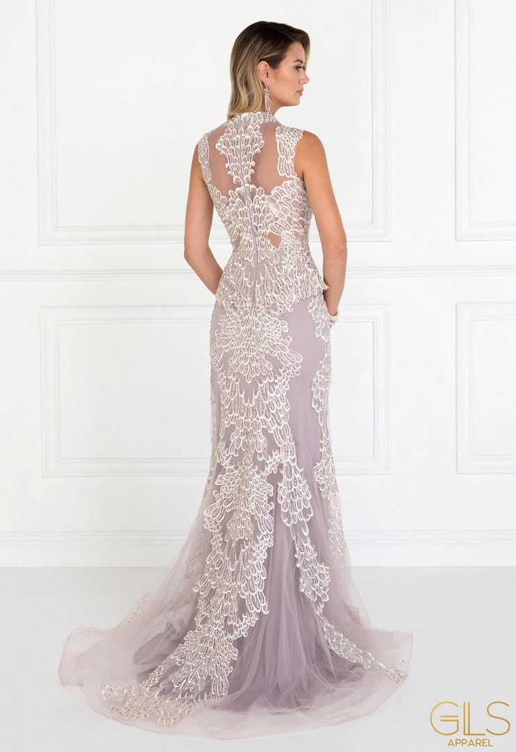 Make a statement in this long sleeveless embroidered mauve dress with illusion back by Elizabeth K GL1530. Sleeveless bold embroidery full length dress with a scoop neckline on a mermaid silhouette. Has mesh and sheer panel cutouts on back with zipper close. Full embroidery detail on front and back from strap to bottom skirt. Perfect for any formal event!