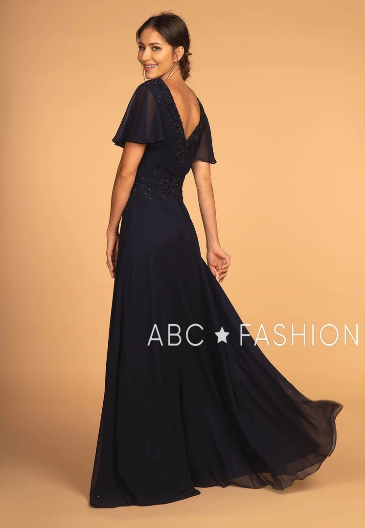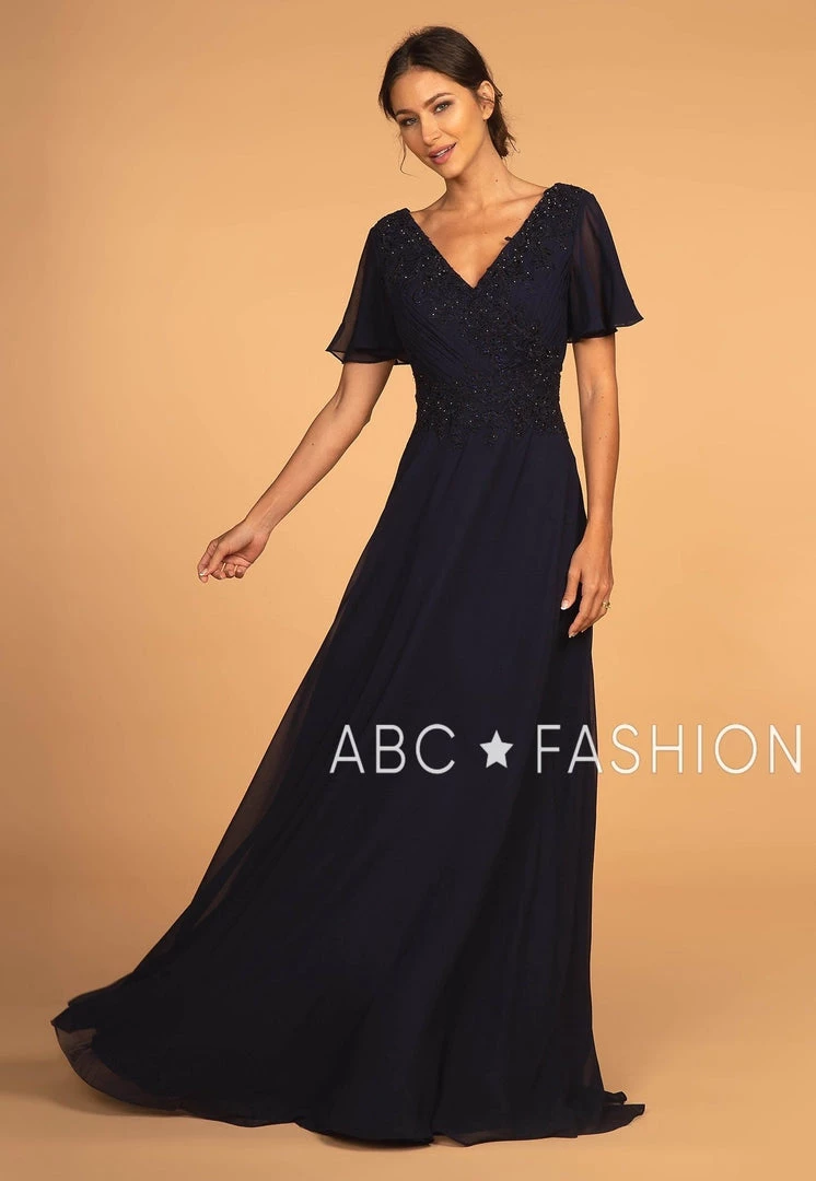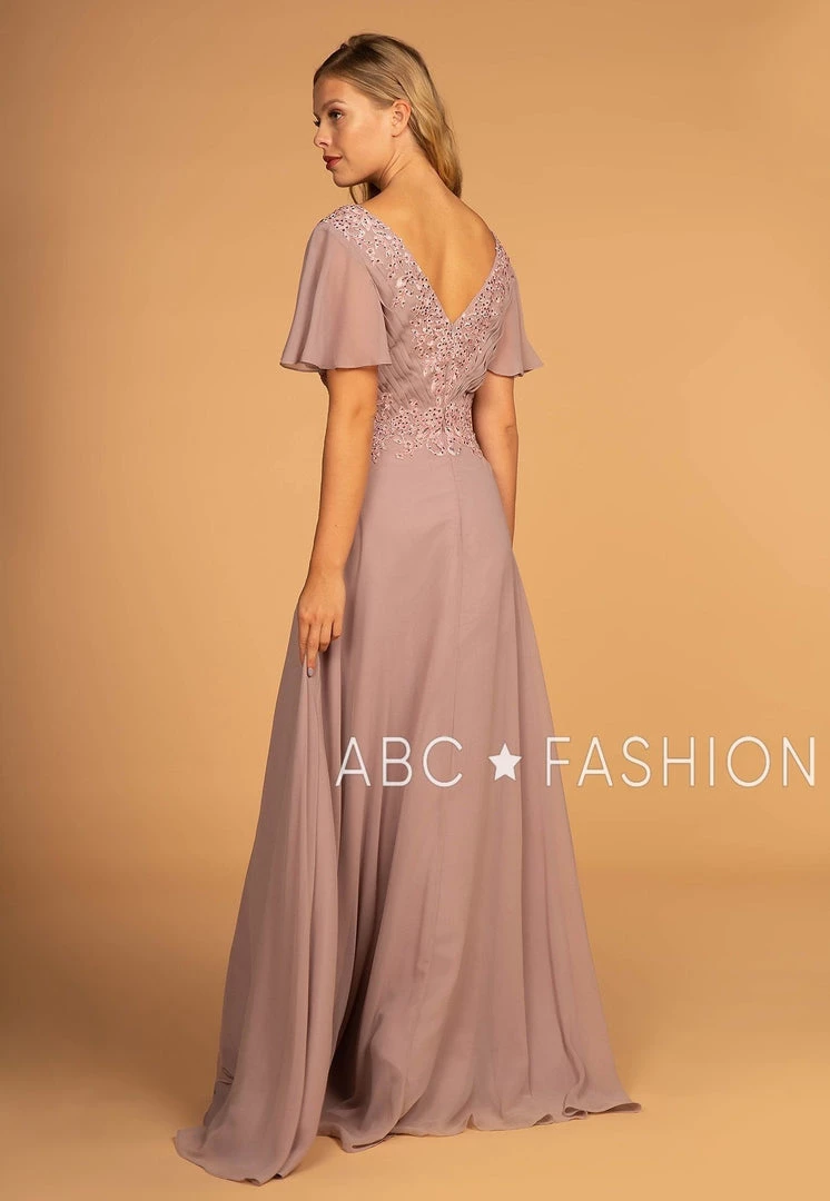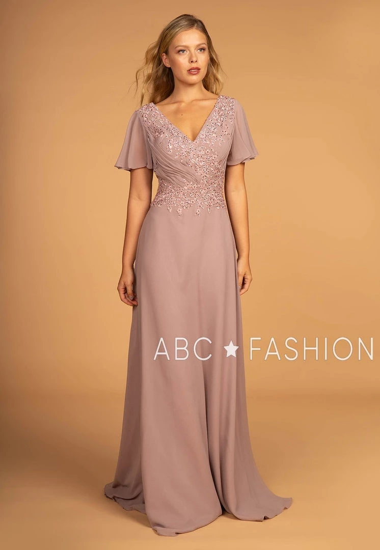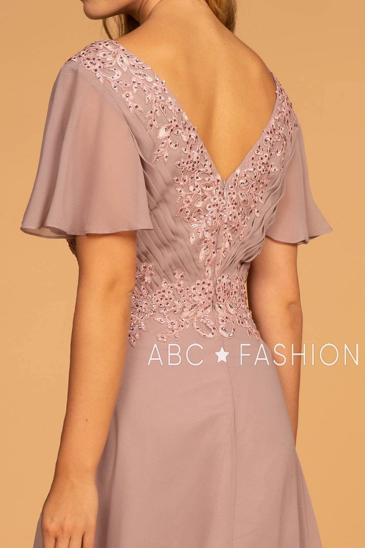 Turn heads in this embroidered V-neck gown with short sleeves by Elizabeth K GL2520. This long evening dress features a ruched V-neck bodice adorned with beautiful floral embroidery accented with dainty beads that cascades down to the waistline, short sleeves, modest open V-back, a floor length A-line chiffon skirt, and a zipper closure. Affordably priced under $300, this dress is perfect for any formal event and will keep you on budget!