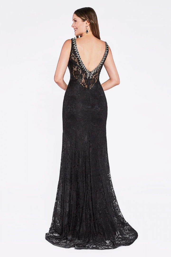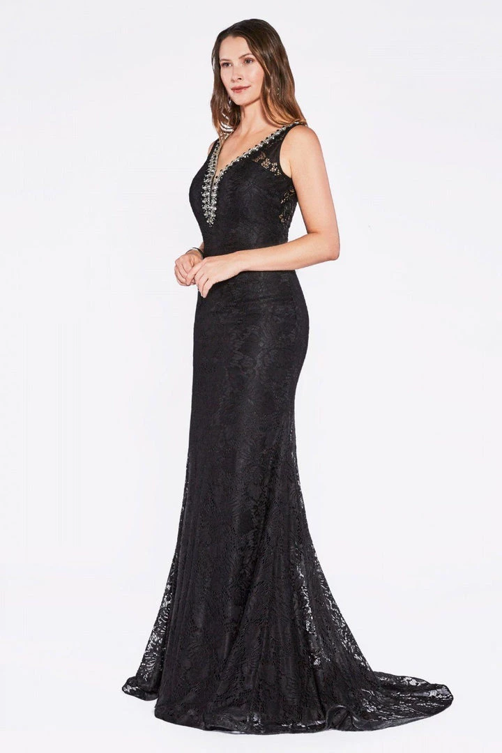 Dance the night away in this black long V-neck lace dress with fitted by Cinderella Divine P206.