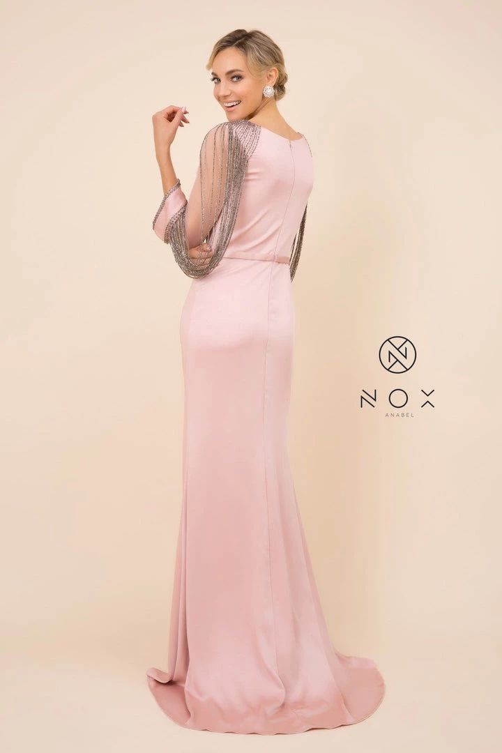 Look modest chic in this long fitted dress with beaded sleeves by Nox Anabel Y410.