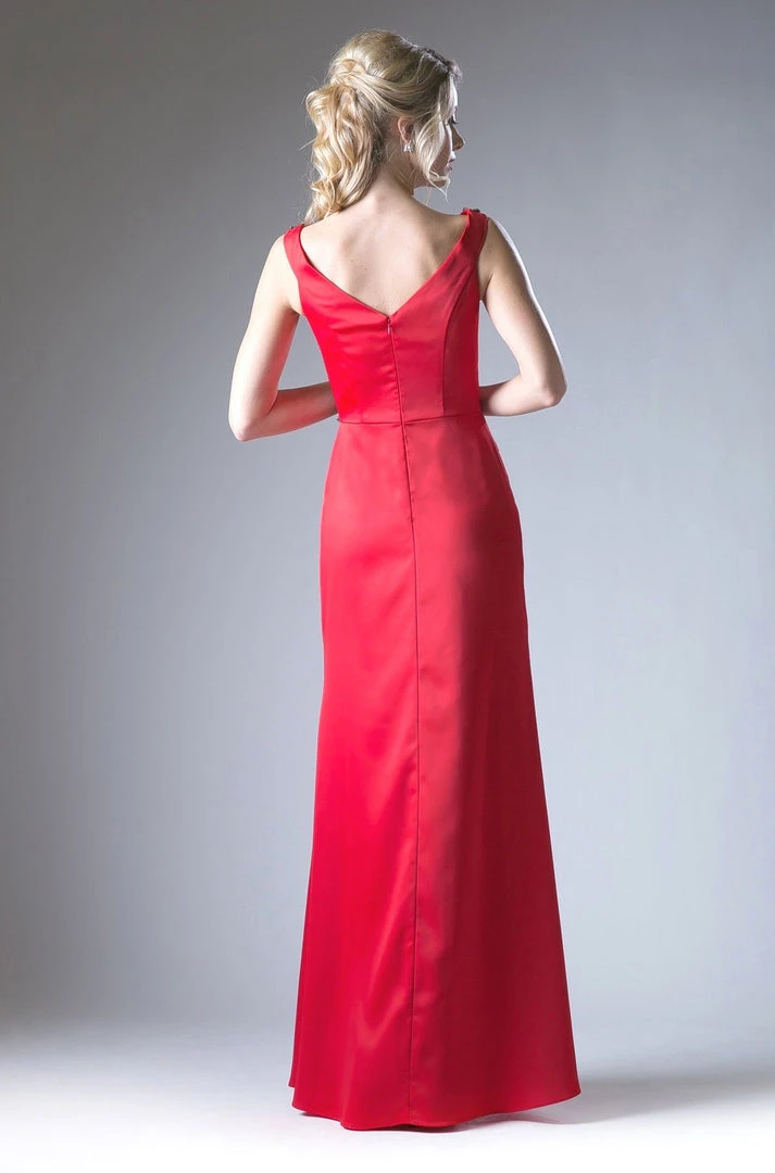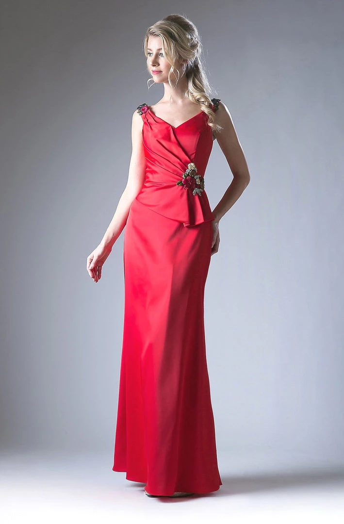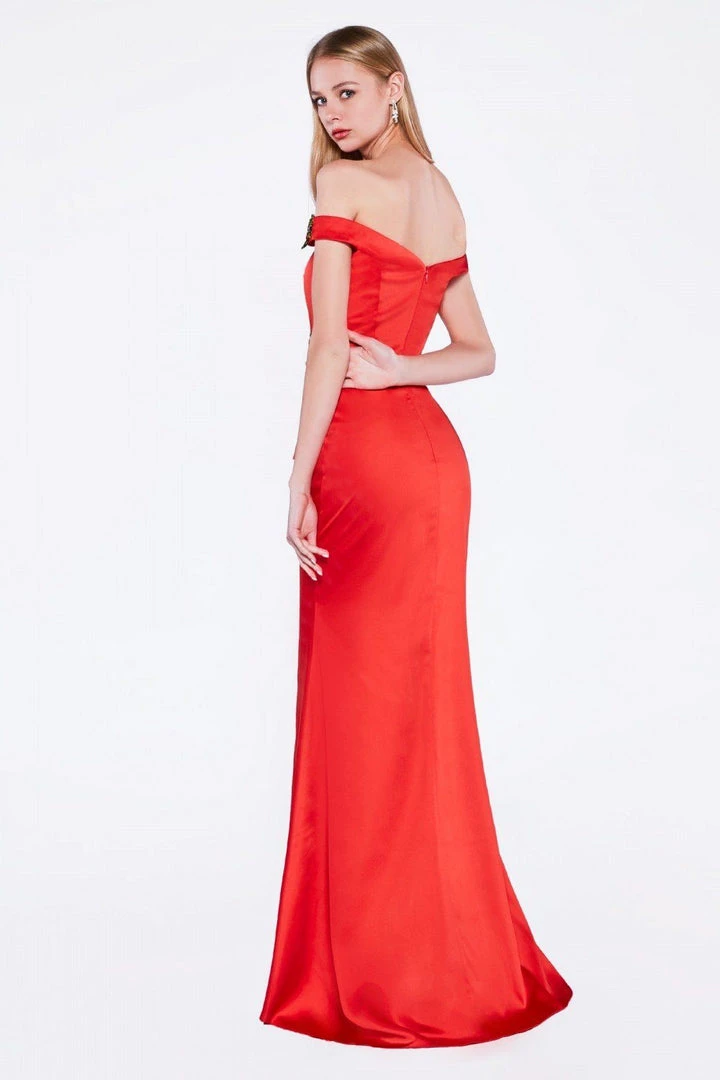 Look picture perfect in this red long off the shoulder satin mermaid dress by Cinderella Divine CH520.