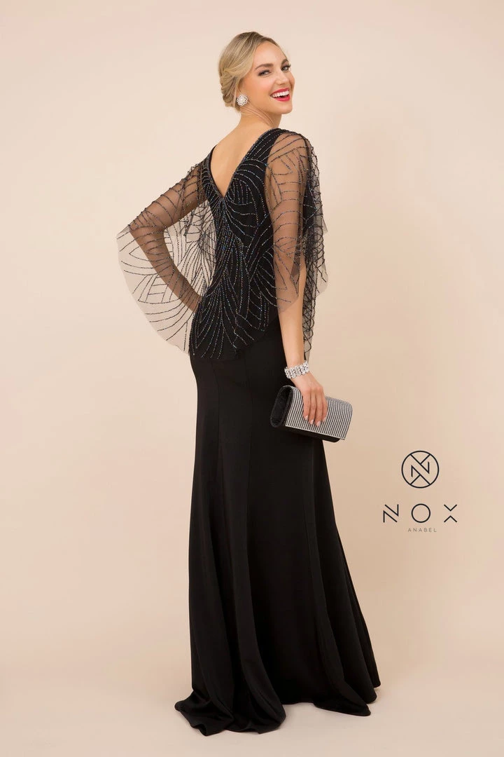 Receive lots of compliments in this long fitted V-neck dress with beaded sheer cape by Nox Anabel Y531.