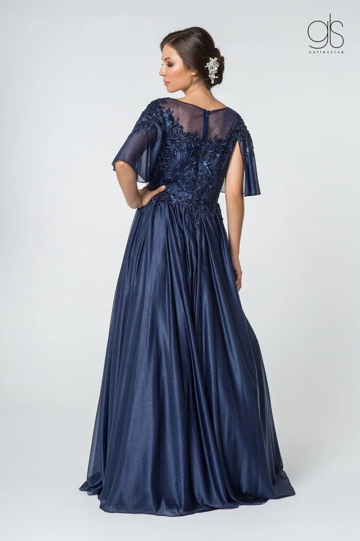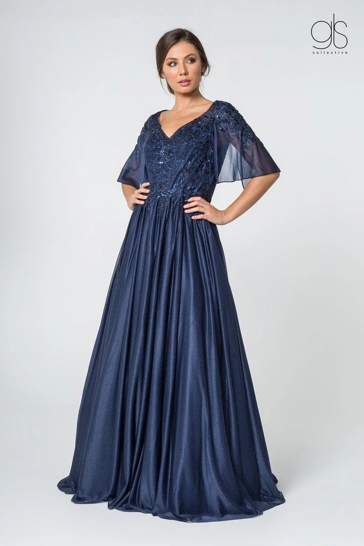 Look picture-perfect in this floral applique bodice V-neck gown with flutter sleeves by Elizabeth K GL2830.