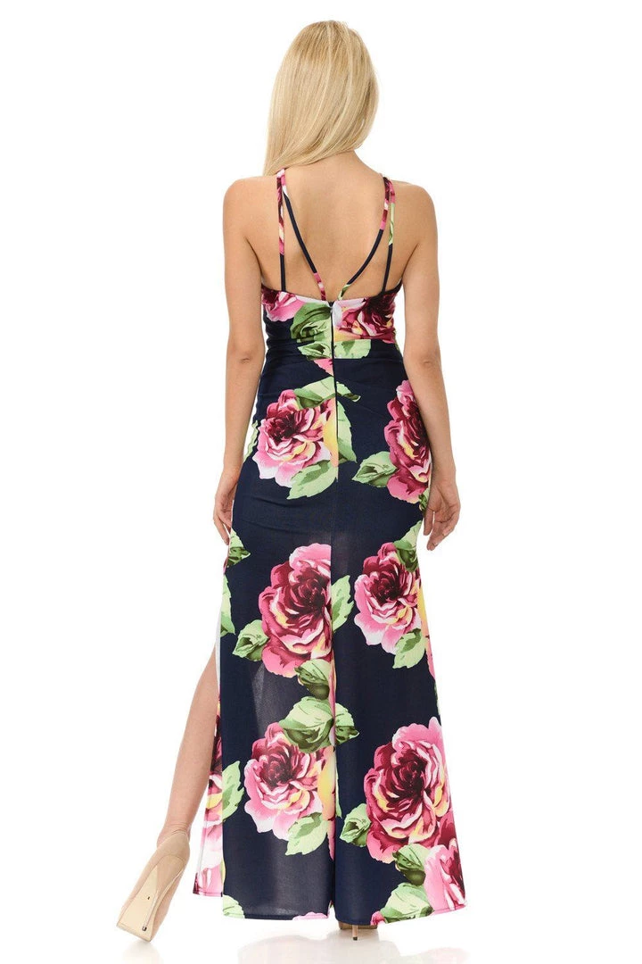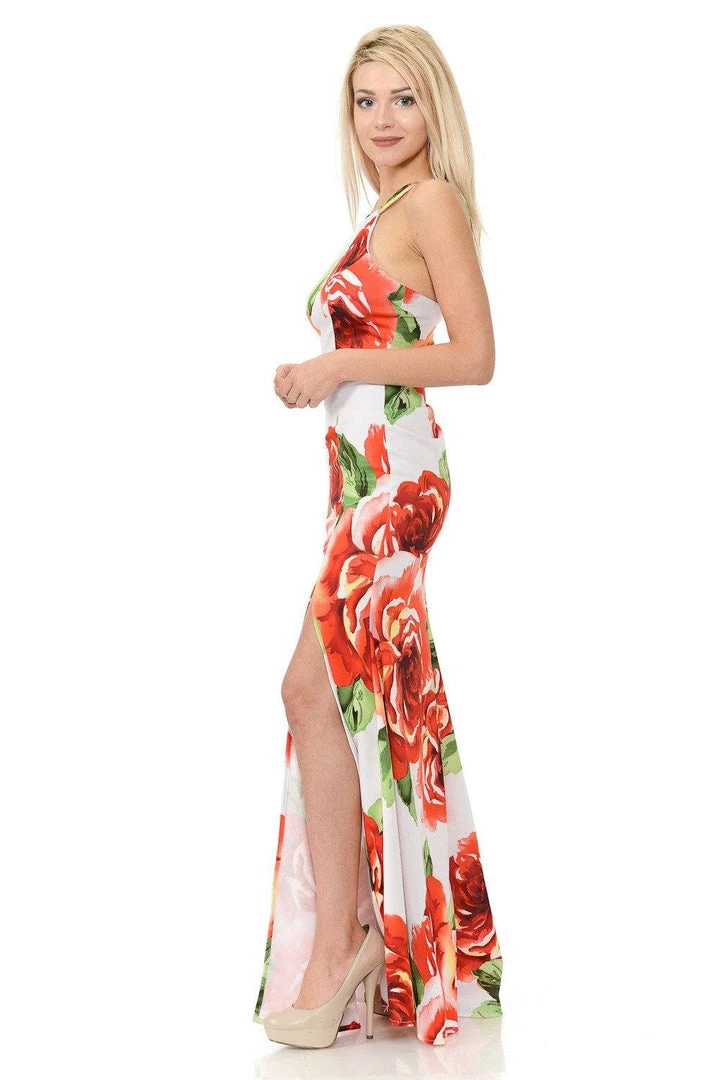 Create picture-perfect memories in this long floral print maxi dress with slit by Lenovia. This long gown features a high-neck sleeveless bodice, vibrant floral print all throughout the dress, strappy open back, a full length skirt with a slit, and a zipper closure. Perfect for any formal event!
