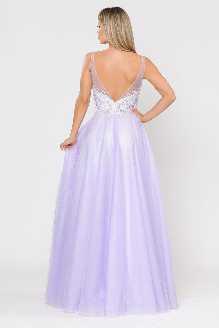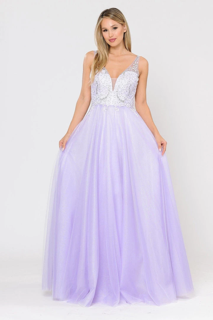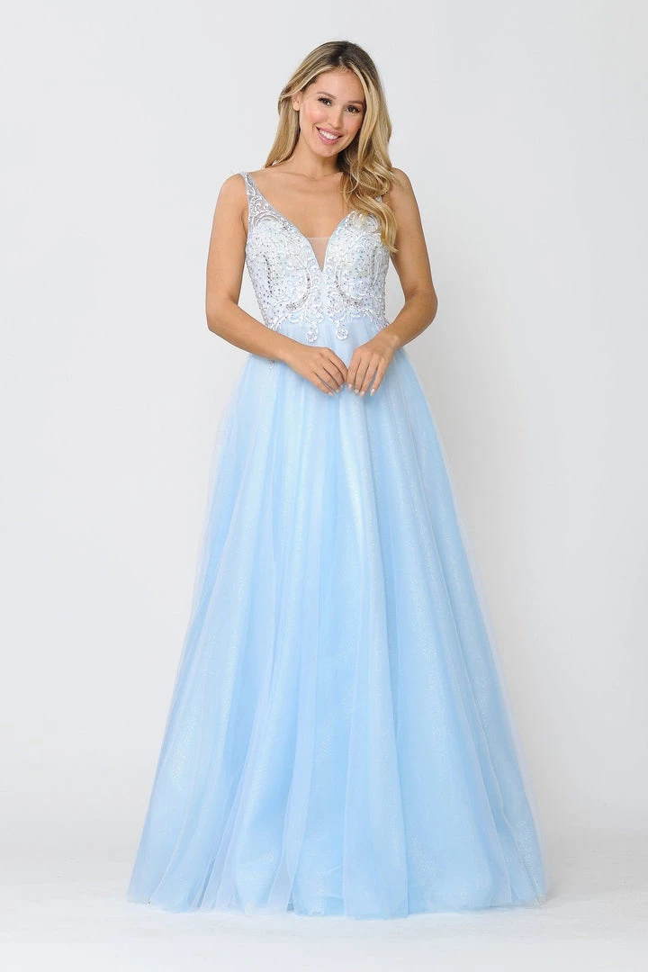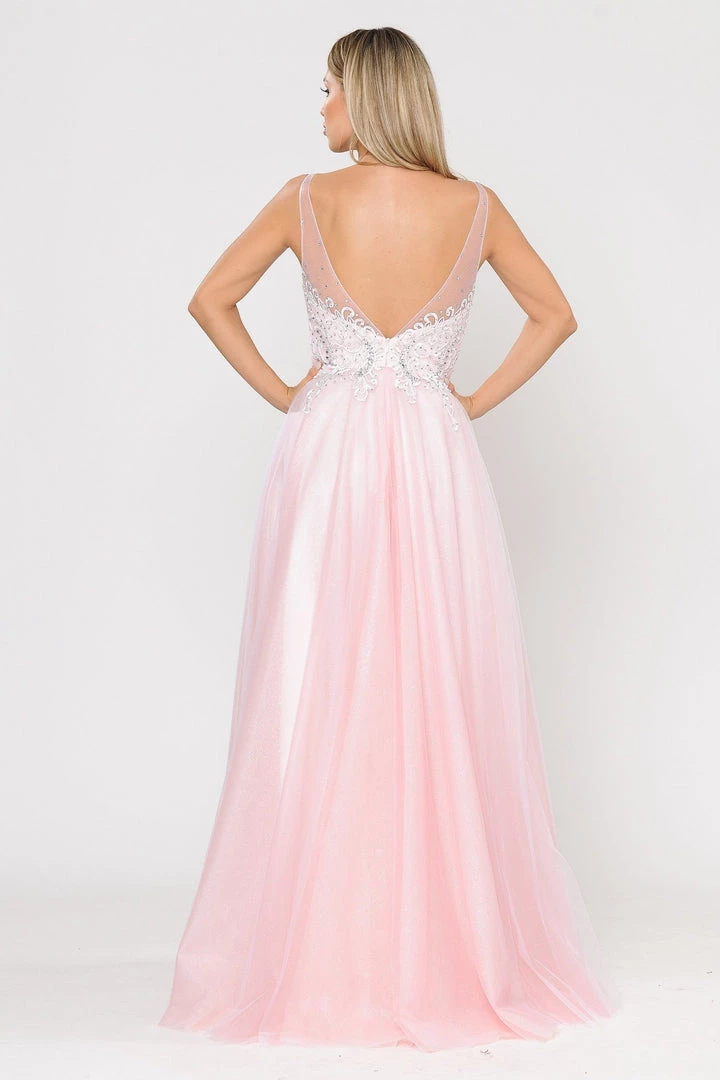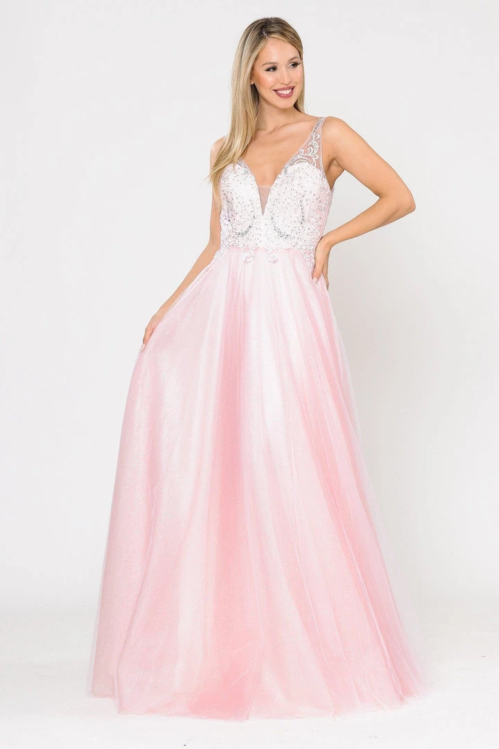 Look radiant in this long A-line glitter dress with embroidered bodice by Poly USA 8354. This beautiful formal gown features a sleeveless illusion V-neck tank bodice adorned with white beaded embroidery, flirty open V-back, floor length A-line glitter mesh skirt, and a zipper closure. Affordably priced under $300, this long evening dress is perfect for any formal event and will keep you on budget!