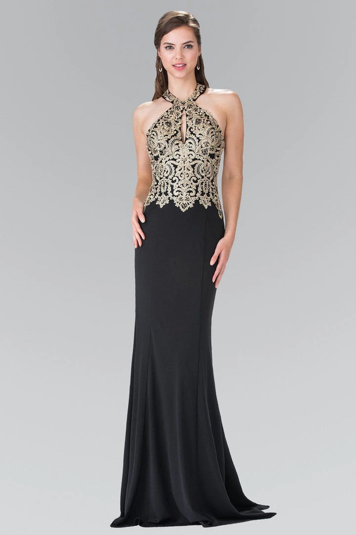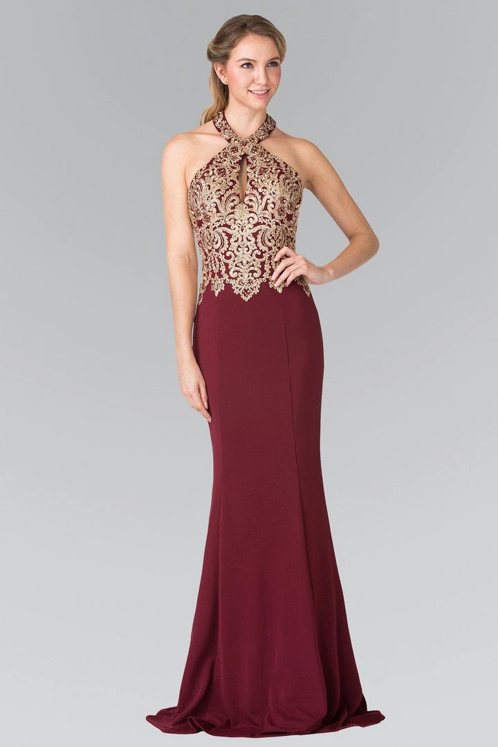 Look radiant in this long gold embroidered halter jersey dress by Elizabeth K.