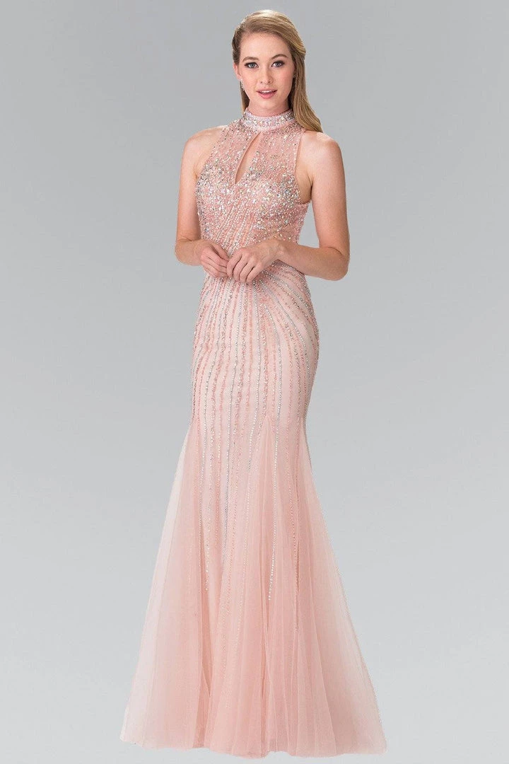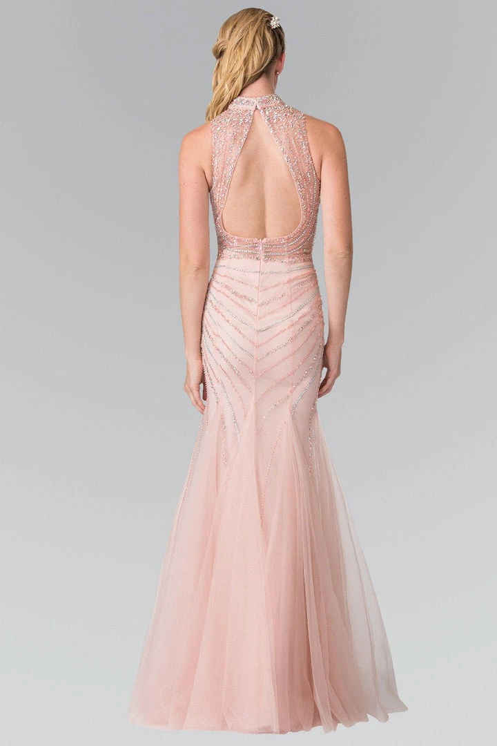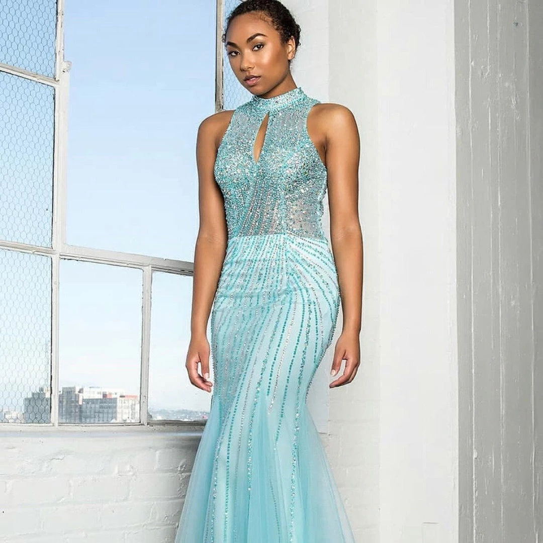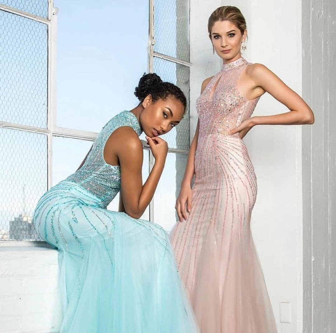 Look radiant in this long halter dress with beaded illusion top by Elizabeth K.