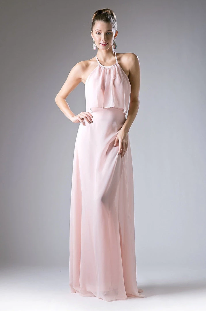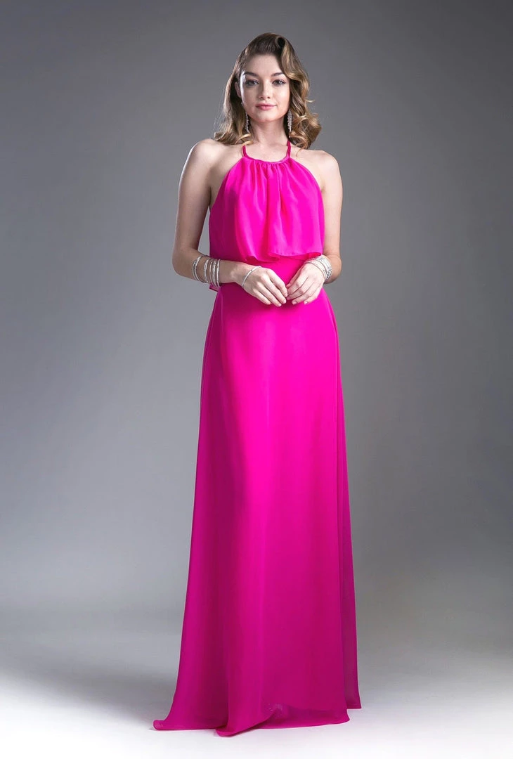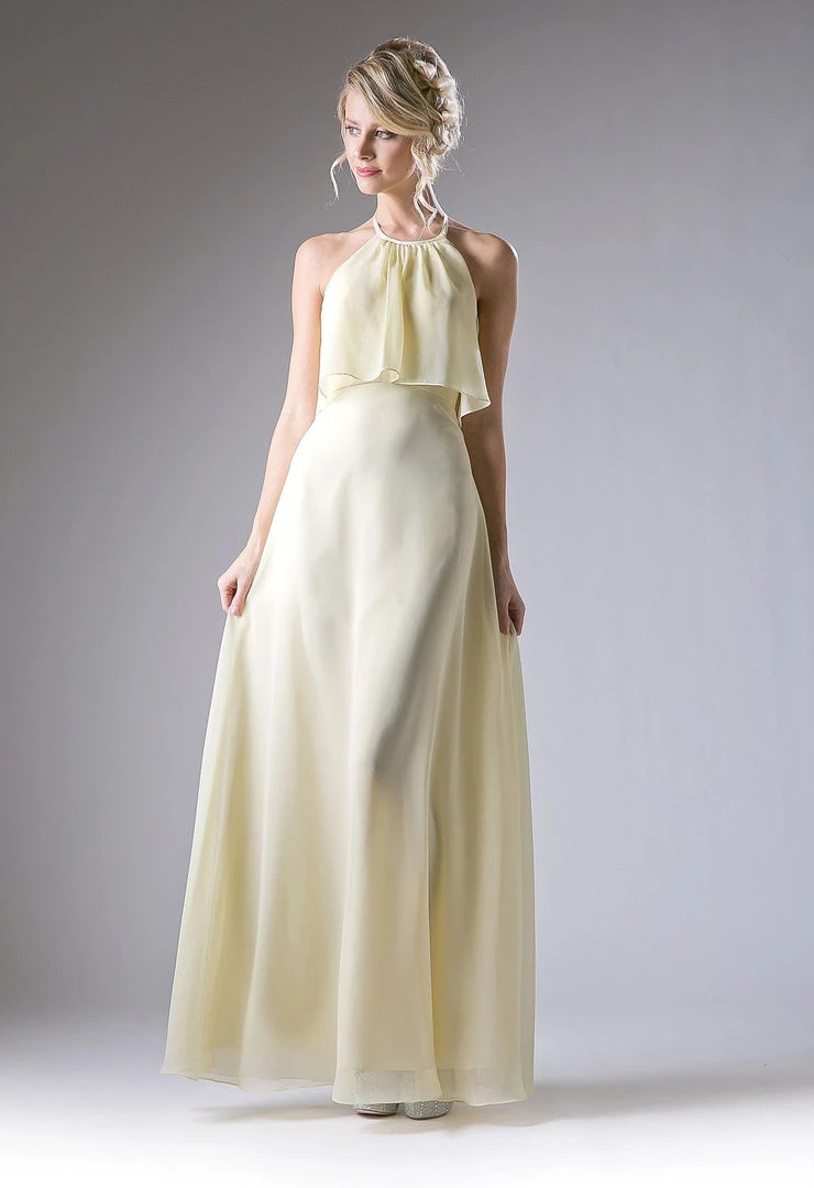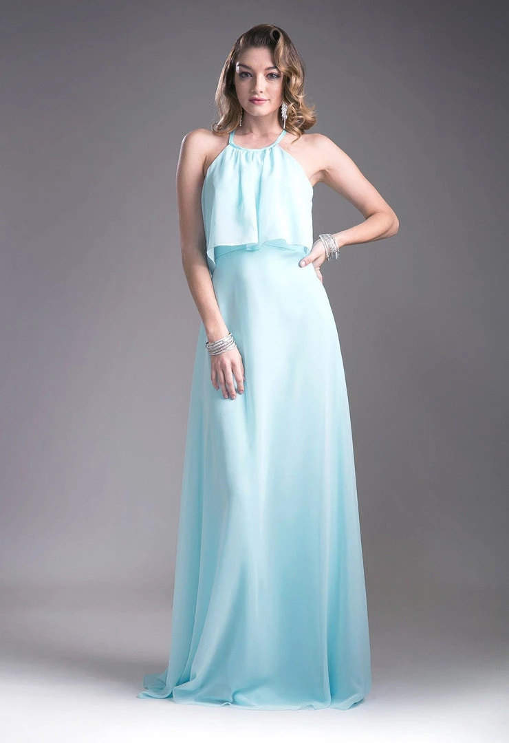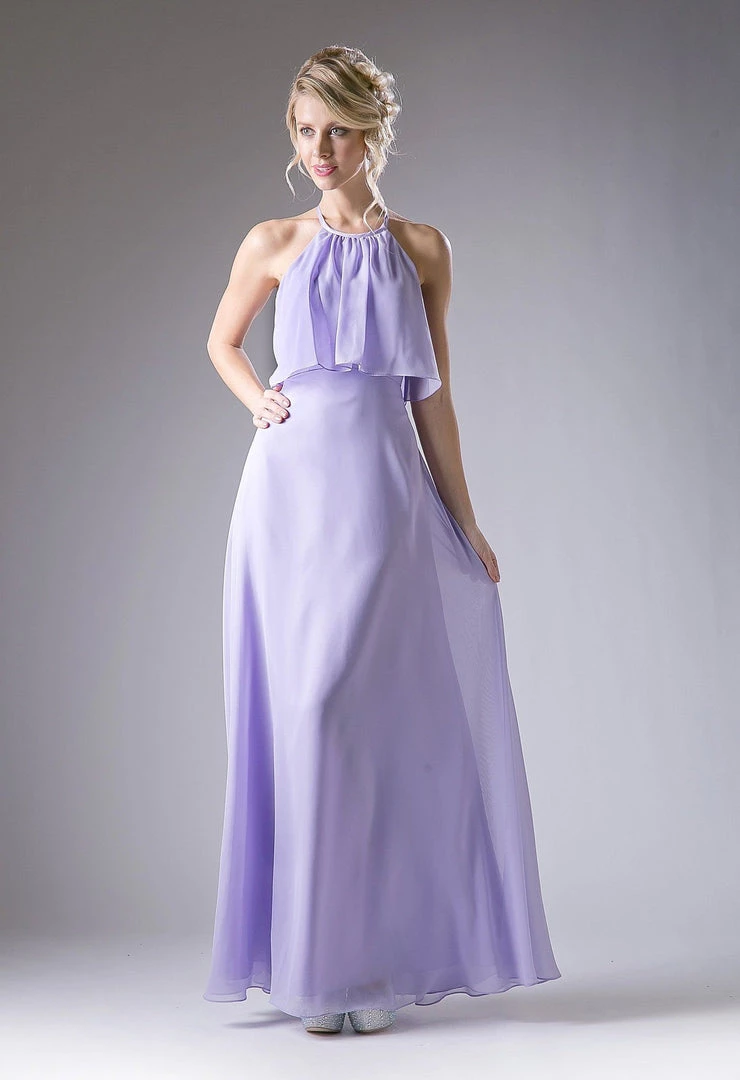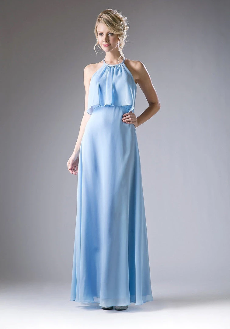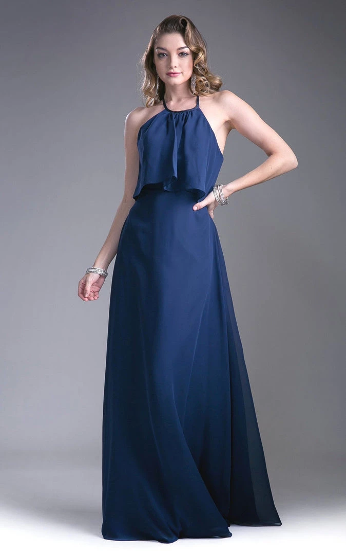 Look modest chic in this long A-line halter dress with flounced bodice by Cinderella Divine 13031.