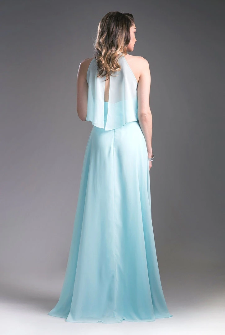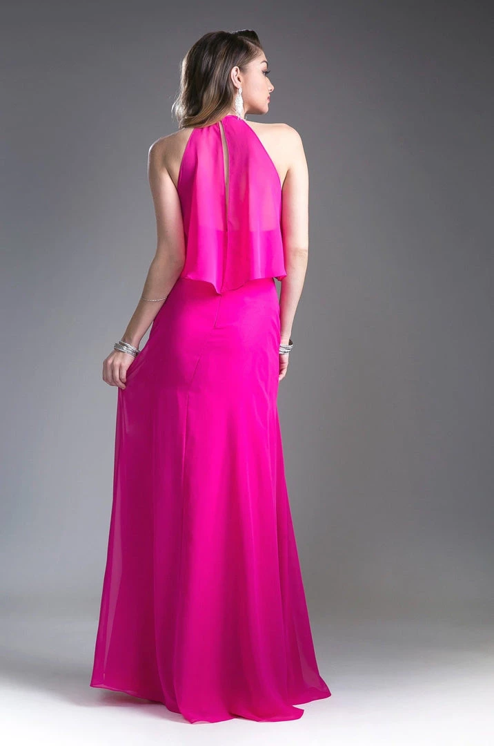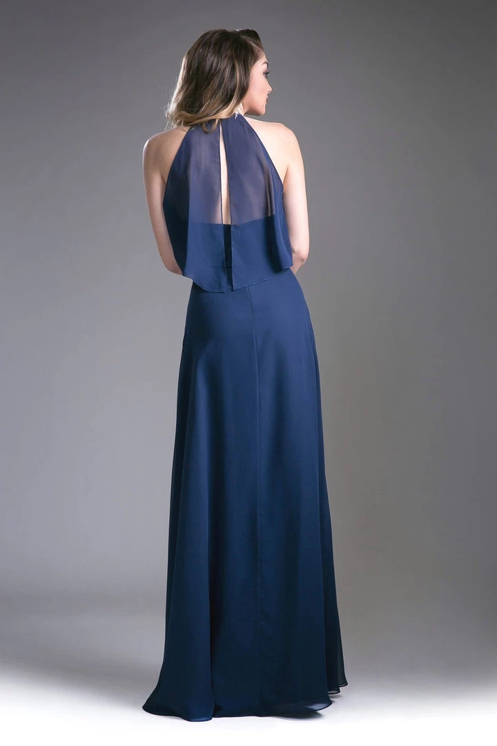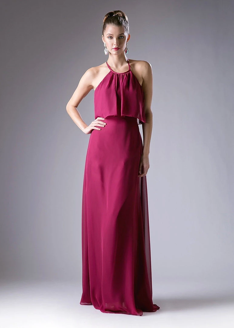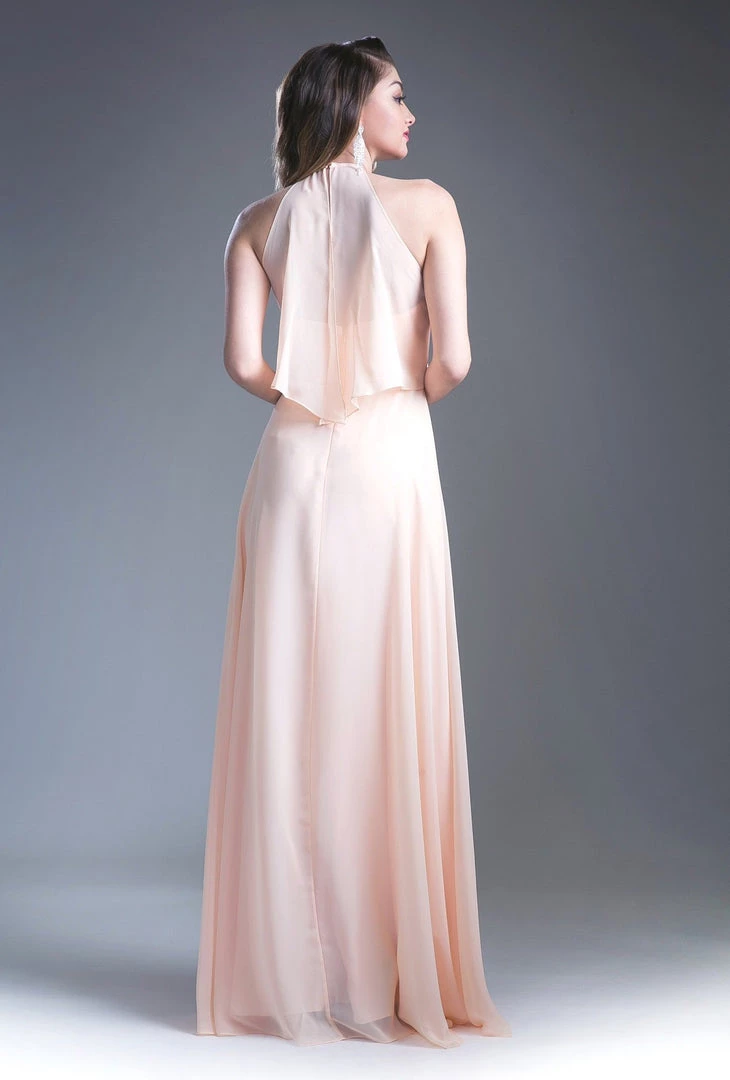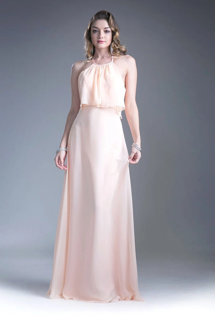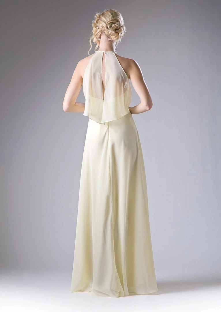 Look modest chic in this long A-line halter dress with flounced bodice by Cinderella Divine 13031.