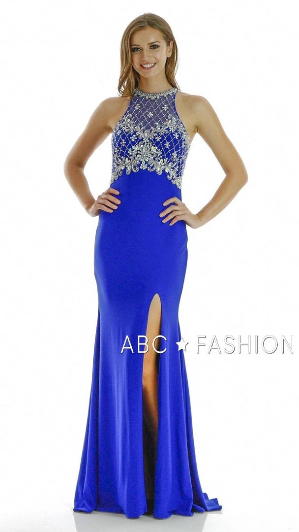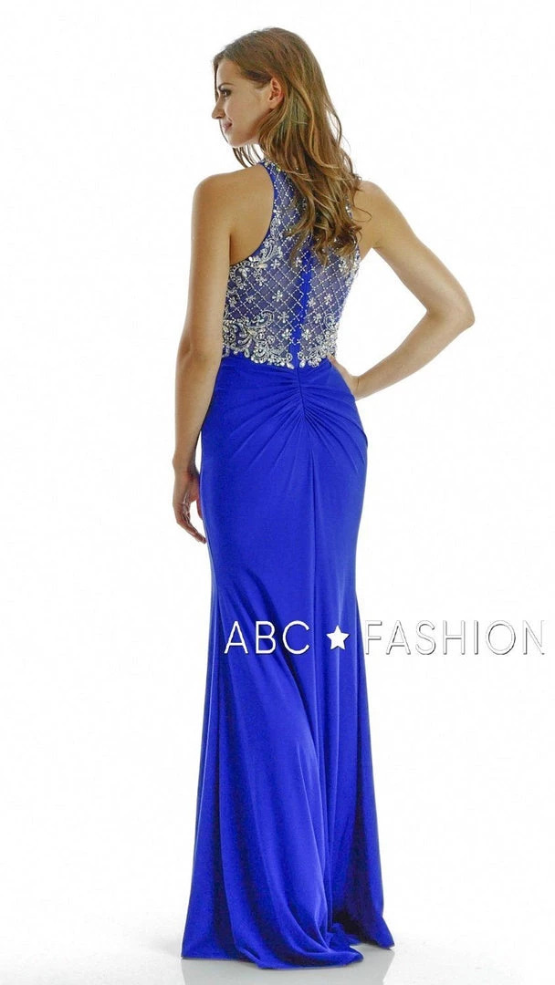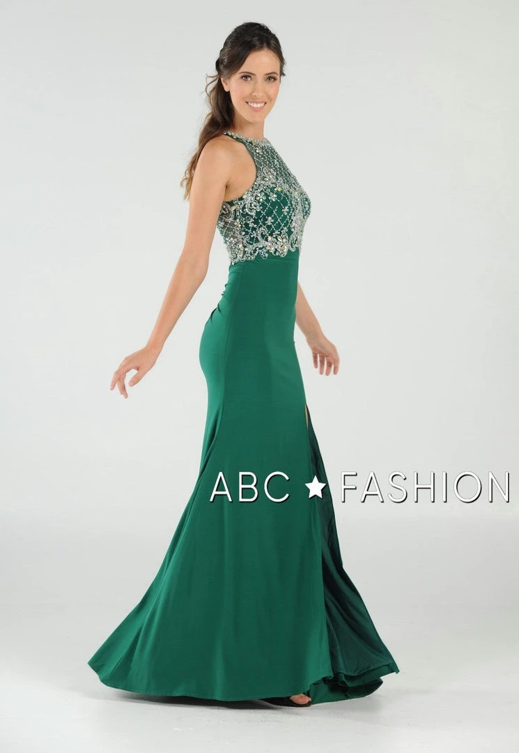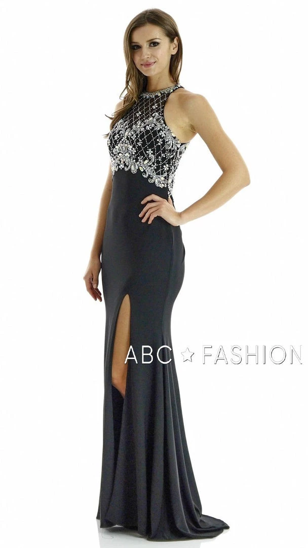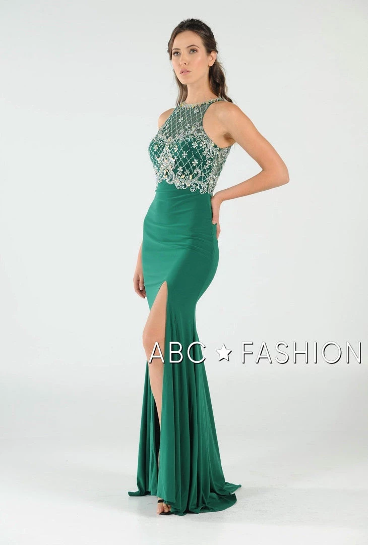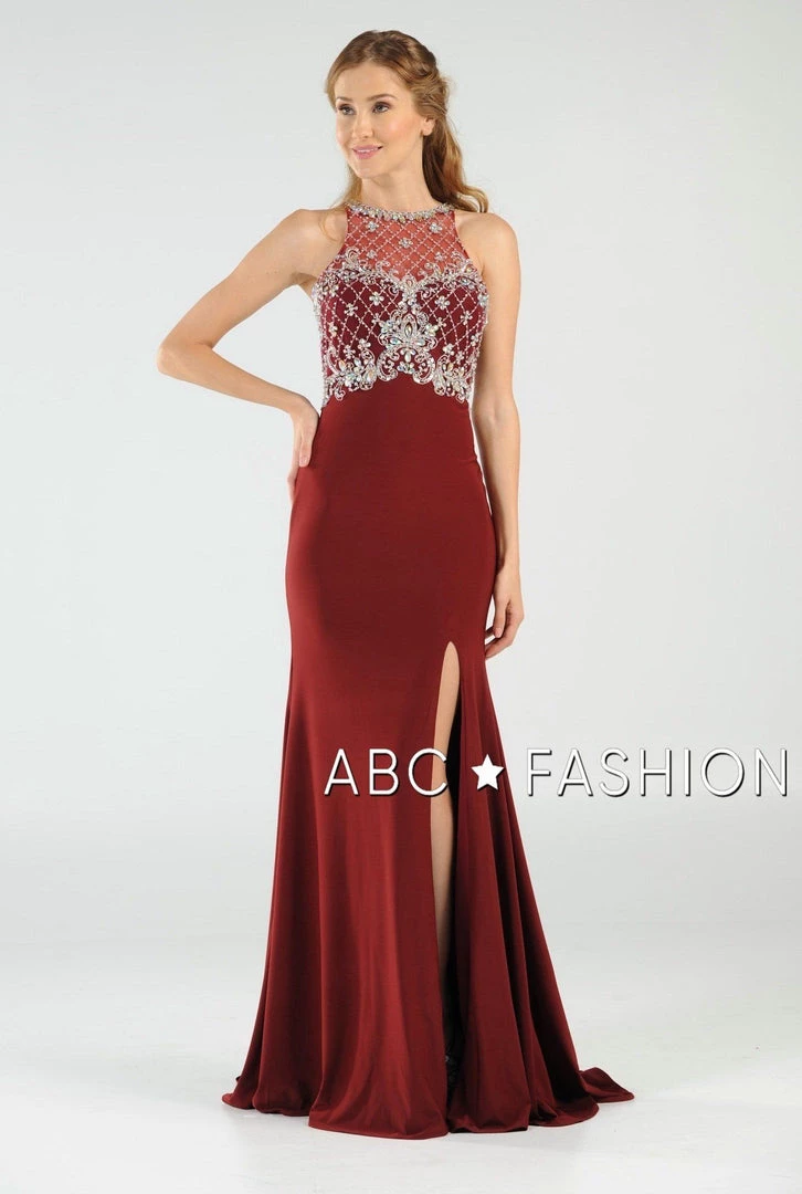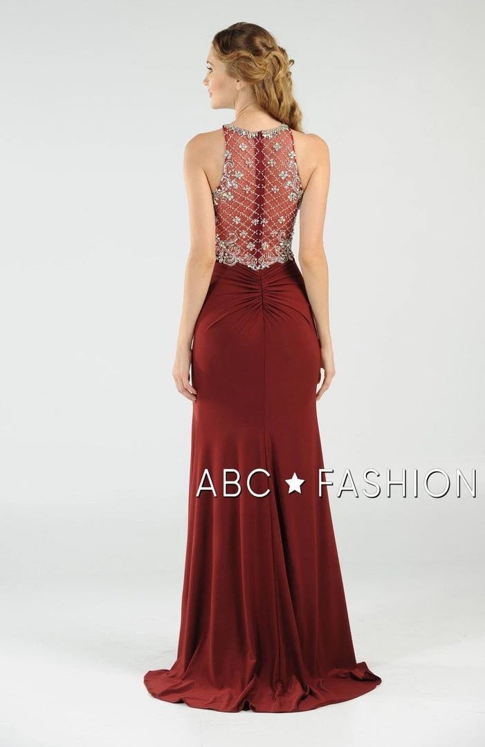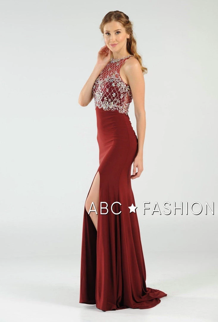 Be selfie-ready in this high-neck gown with beaded illusion bodice by Poly USA 7102. Made of ITY material, this long high-neck dress features a sheer bodice embellished with sparkly beads and rhinestones, front high slit, sweep train, and a zipper closure. Affordably priced under $250, this dress is perfect for any formal event and will keep you on budget!