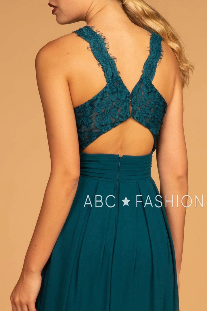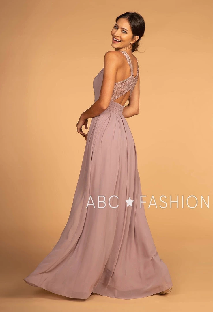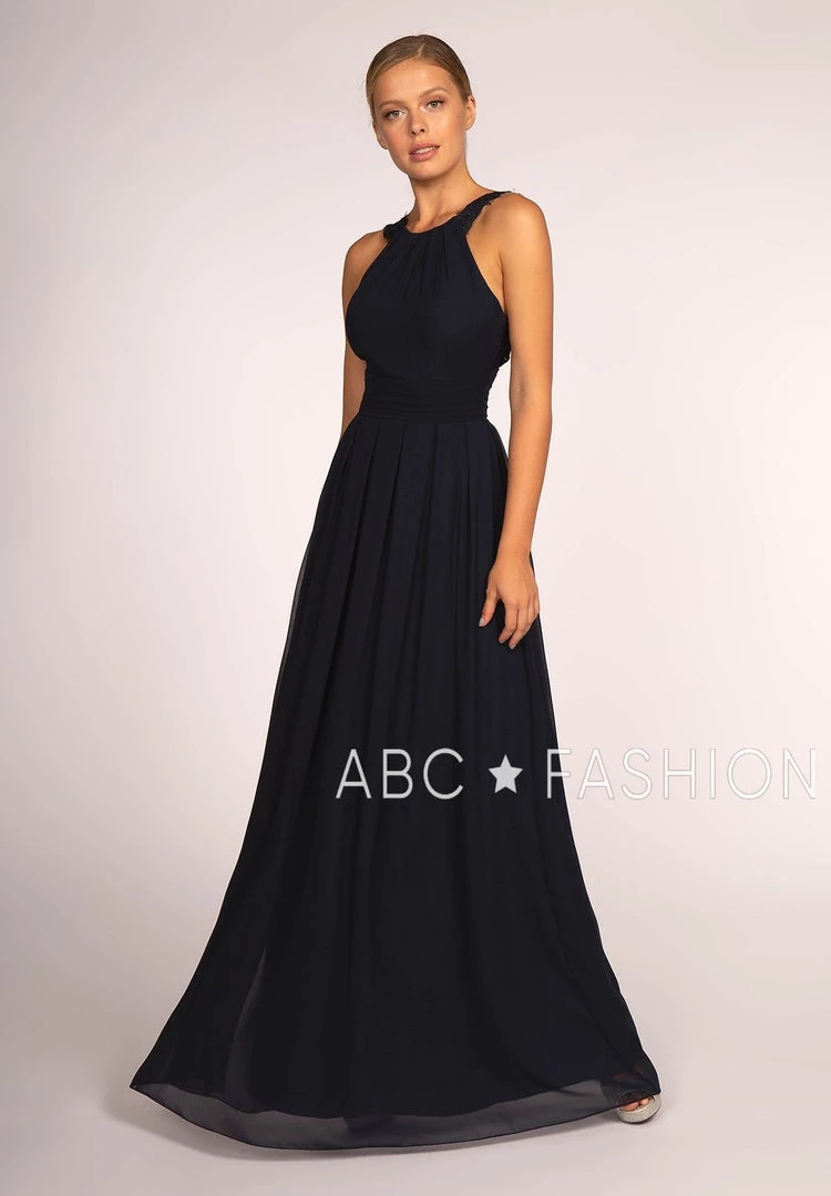 Turn heads in this halter high-neck chiffon gown with lace details by Elizabeth K GL2605. This long evening dress features a halter high-neck bodice adorned with lace details, pleated waistband, a cutout open back with crisscross lace straps, a floor length A-line skirt, and a zipper closure. Affordably priced at $130, this dress is perfect for any formal event and will keep you on budget!