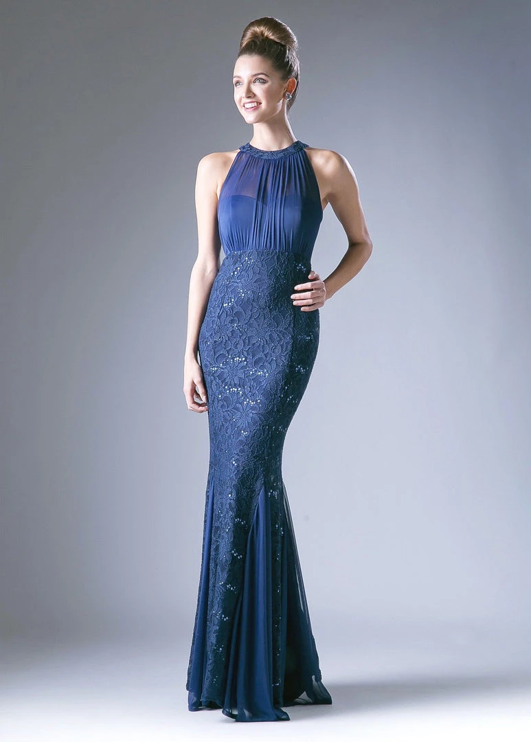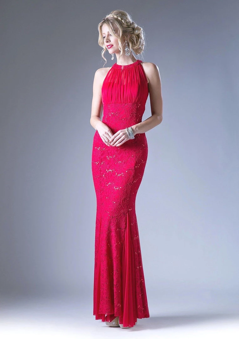 Look timeless in this fitted long high neck lace dress by Cinderella Divine A1613.