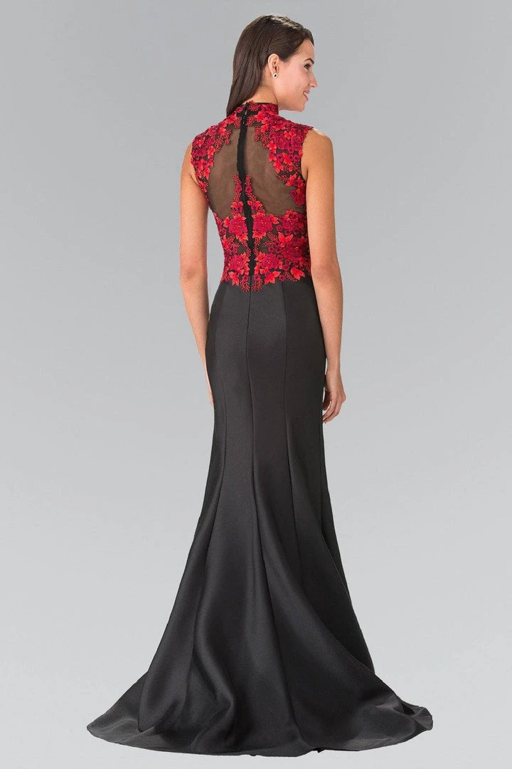 Fall in love with this long high neck dress with embroidered illusion bodice by Elizabeth K.