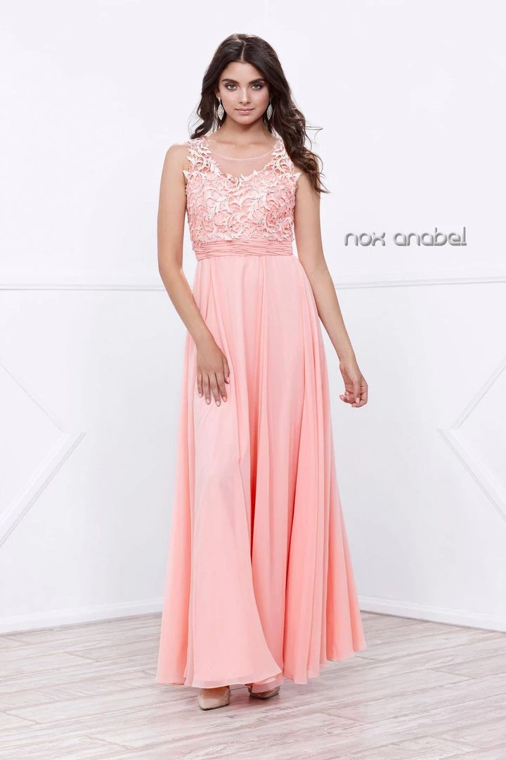 Light up the room in this long illusion dress with lace bodice by Nox Anabel 8334. This long evening gown features a sheer illusion sleeveless bodice that is embroidered with luxurious beaded lace, ruched waistband, long skirt, and a zipper closure.