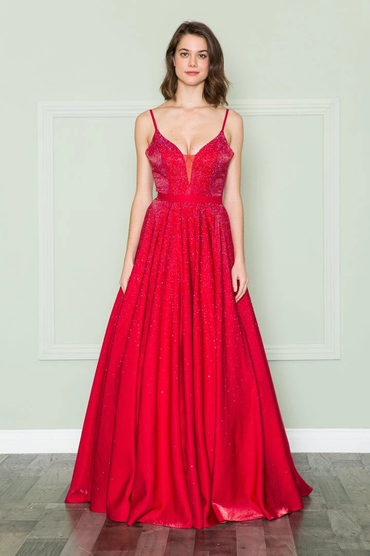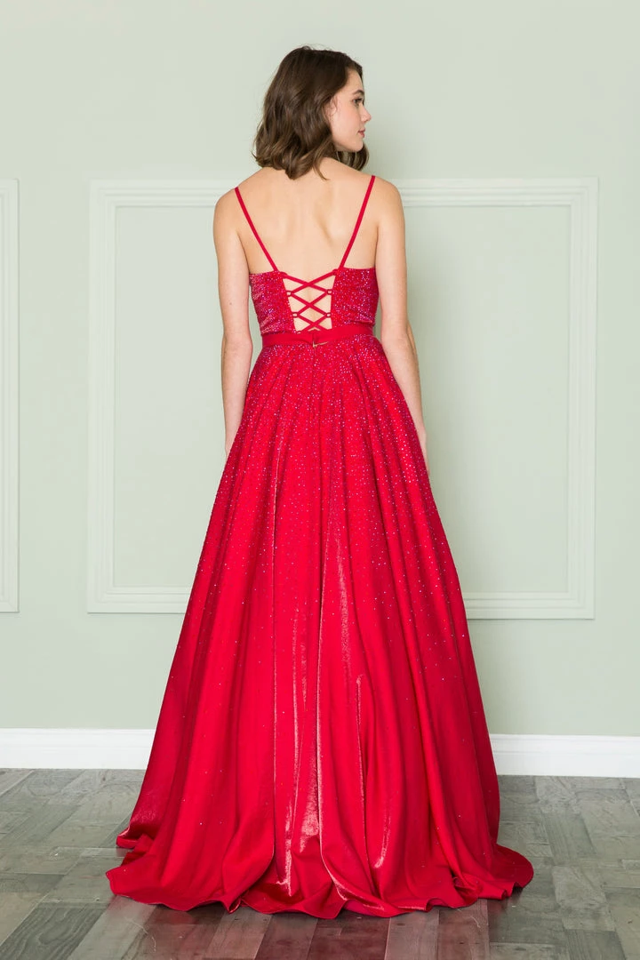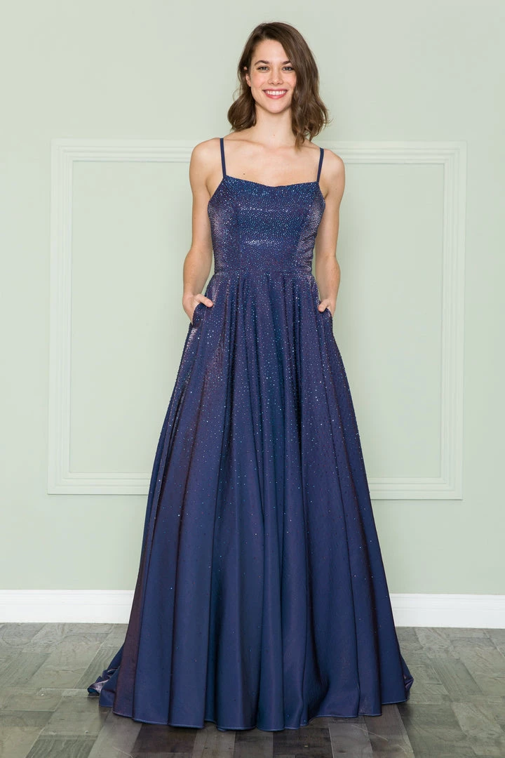 Be selfie ready in this long rhinestone beaded sleeveless A-line dress with leg slit by Poly USA 8886. This sparkling gown is made with two tone shimmer and beaded with rhinestones. This gown features a sleeveless sweetheart neckline, lace up back with adjustable straps, open back, floor length A-line skirt with a sweep train, side leg slit, hand pockets, and a zipper closure.