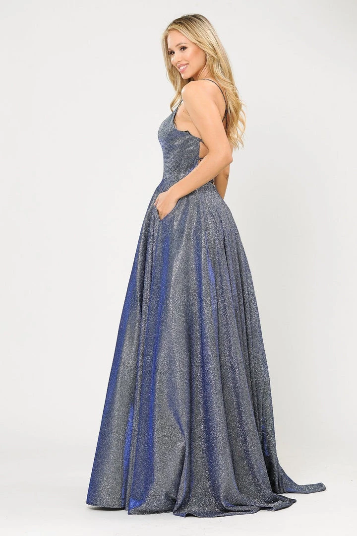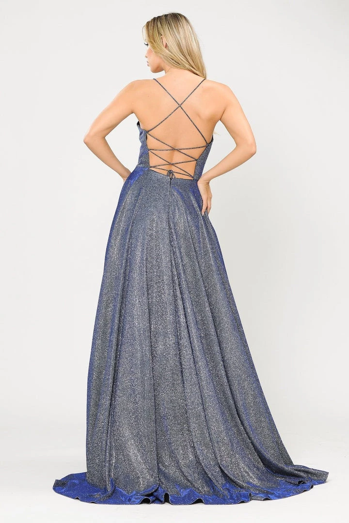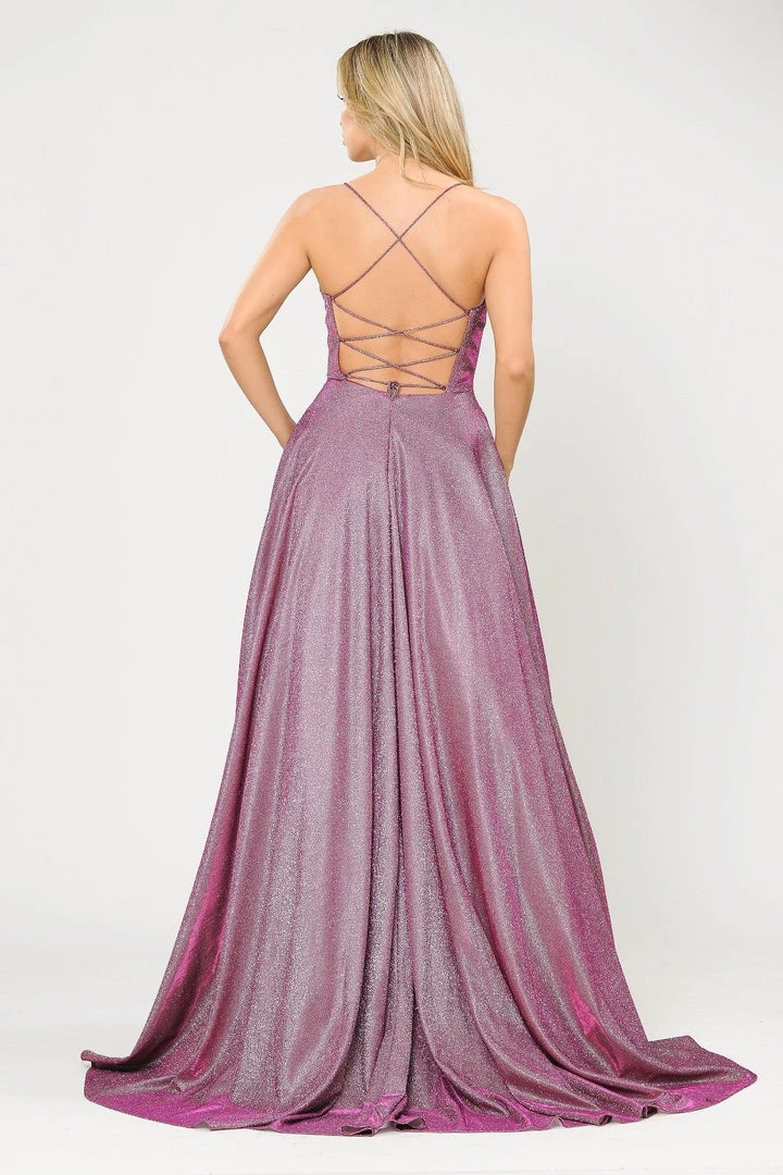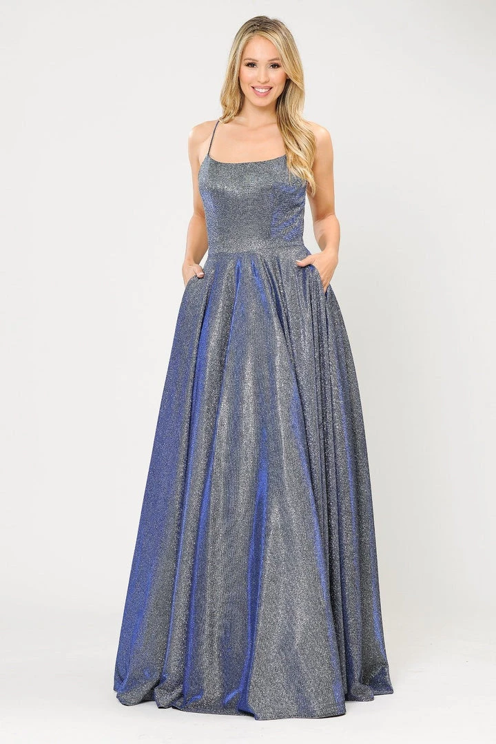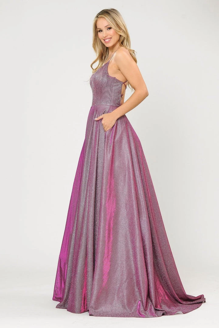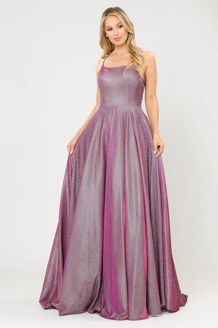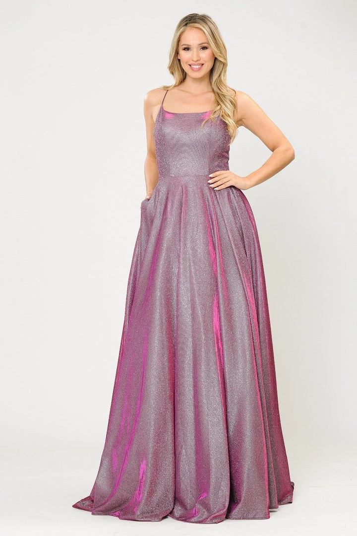 Be a trendsetter in this long iridescent glitter dress with corset open back by Poly USA 8574. This beautiful formal gown features a sleeveless square neck bodice secured with spaghetti straps, flirty crisscross open corset back, side pockets, floor length A-line skirt with a small train, and a lace-up back. Affordably priced at $249, this long evening dress is perfect for any formal event and will keep you on budget!