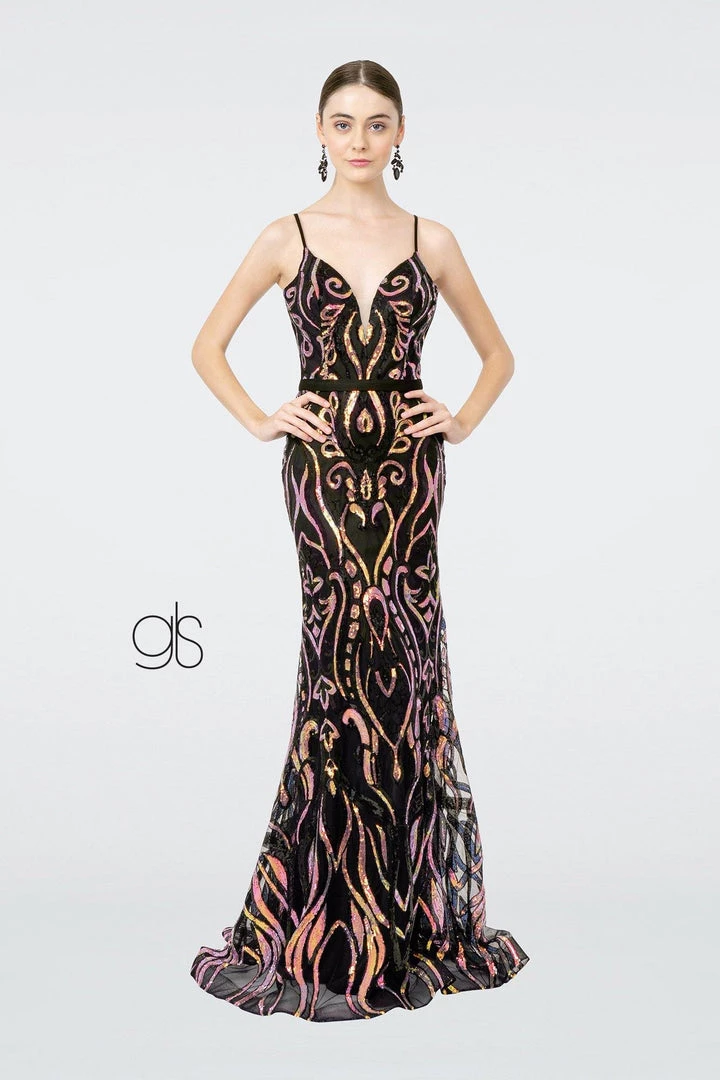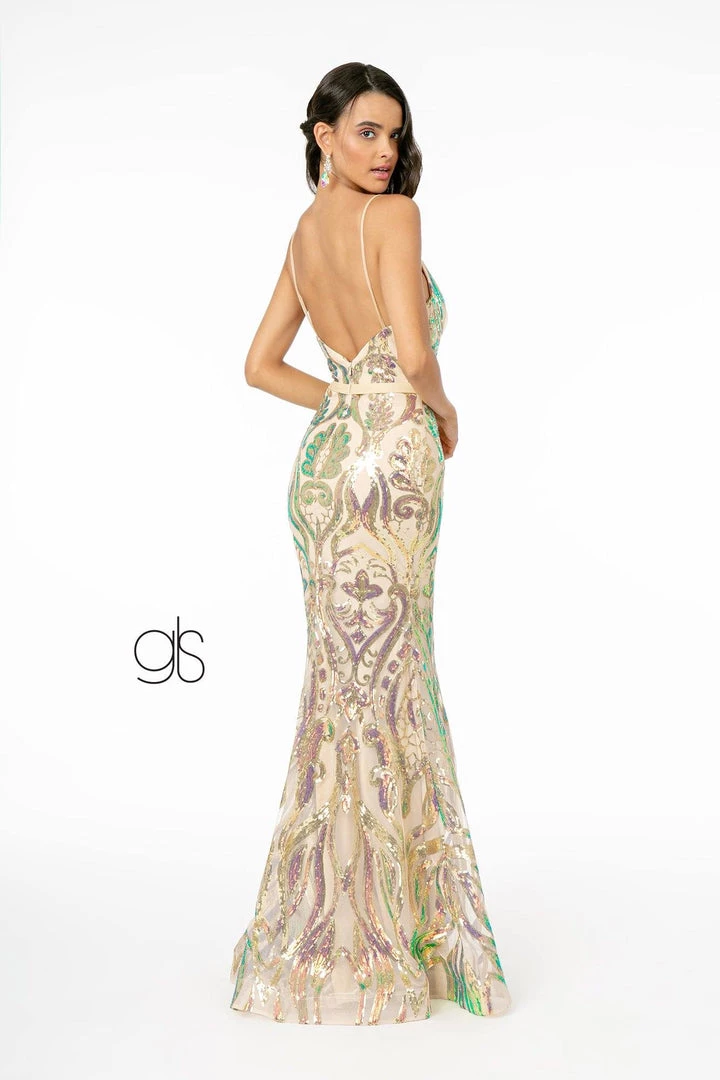 - Fitted Long Iridescent Sequin Pattern Dress with Open Back