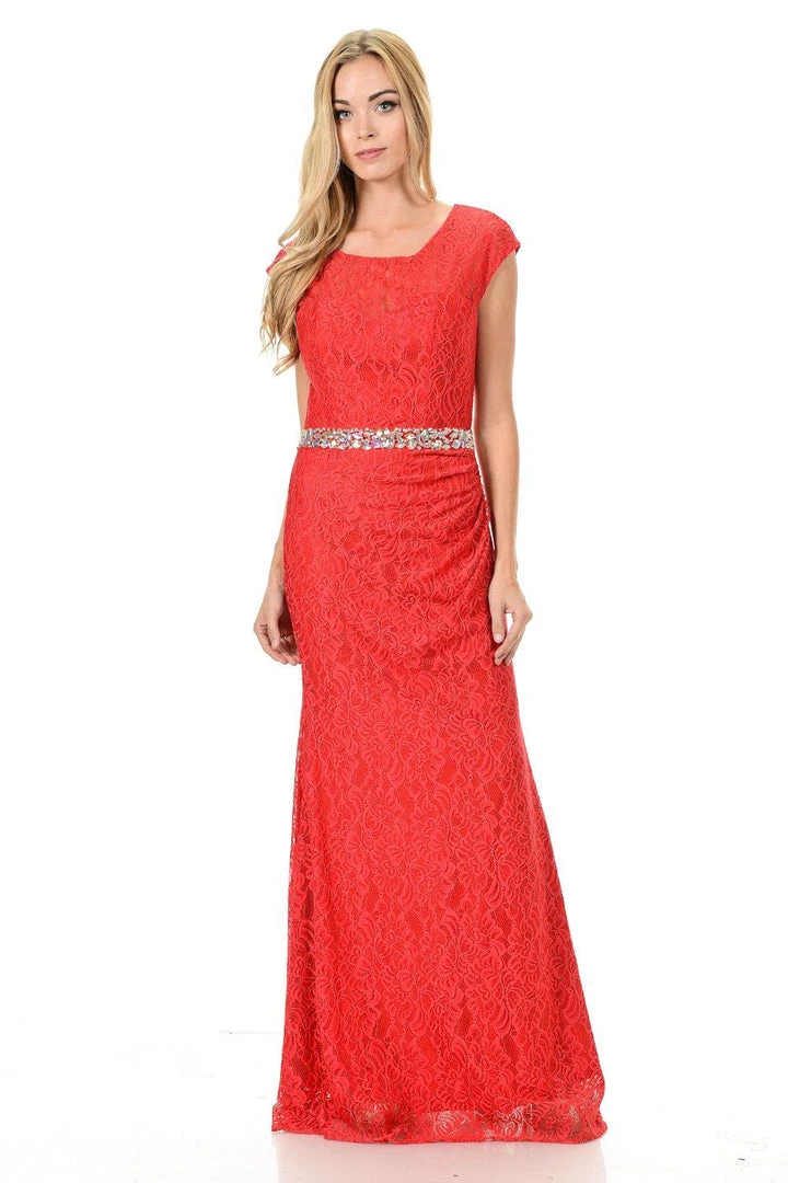 Look unforgettable in this long burgundy cap sleeve lace dress with beaded waist by Lenovia. This long evening lace gown features a cap sleeved sweetheart bodice with a modest scoop neckline, beaded waist, a full length skirt, and a zipper closure. A matching shawl is included with this dress. Perfect for any formal event!
