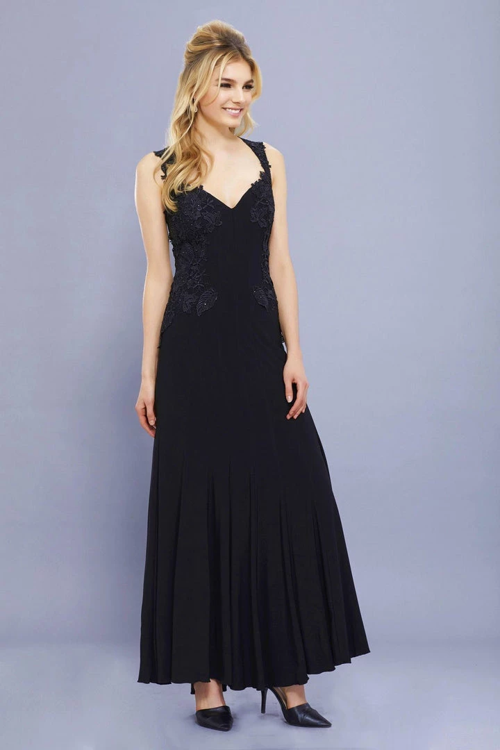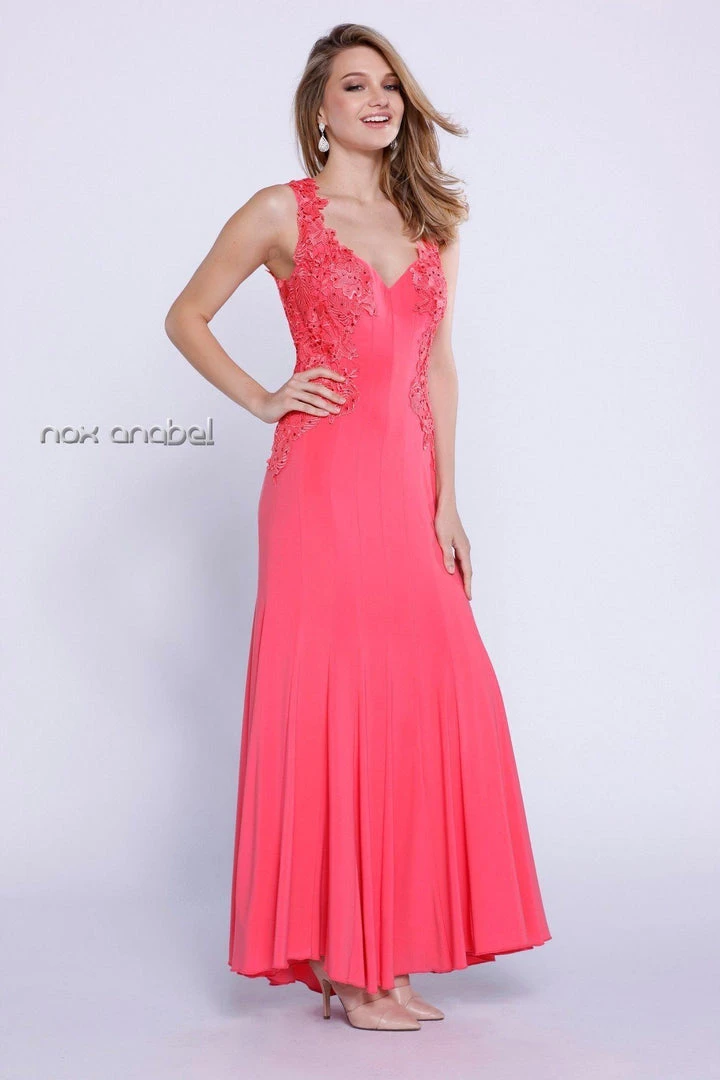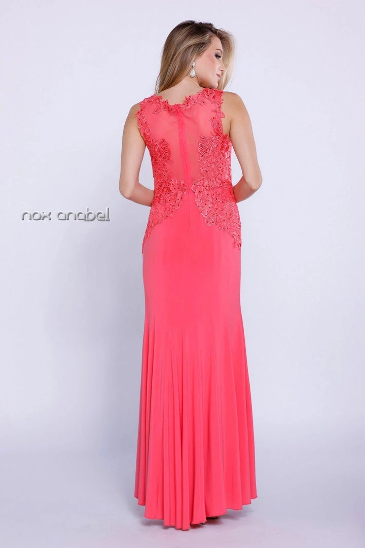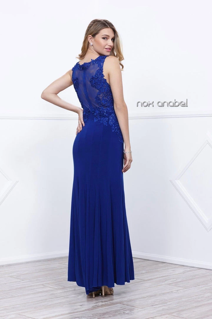 Dazzle the room in this elegant long sleeveless dress with lace embroidery by Nox Anabel Style Number 8258. This long fit and flare evening gown features a sleeveless V-neck bodice accented with a beautiful beaded lace embroidery, sheer illusion back, full length skirt that elegantly moves, and a zipper closure. Perfect for any formal event!