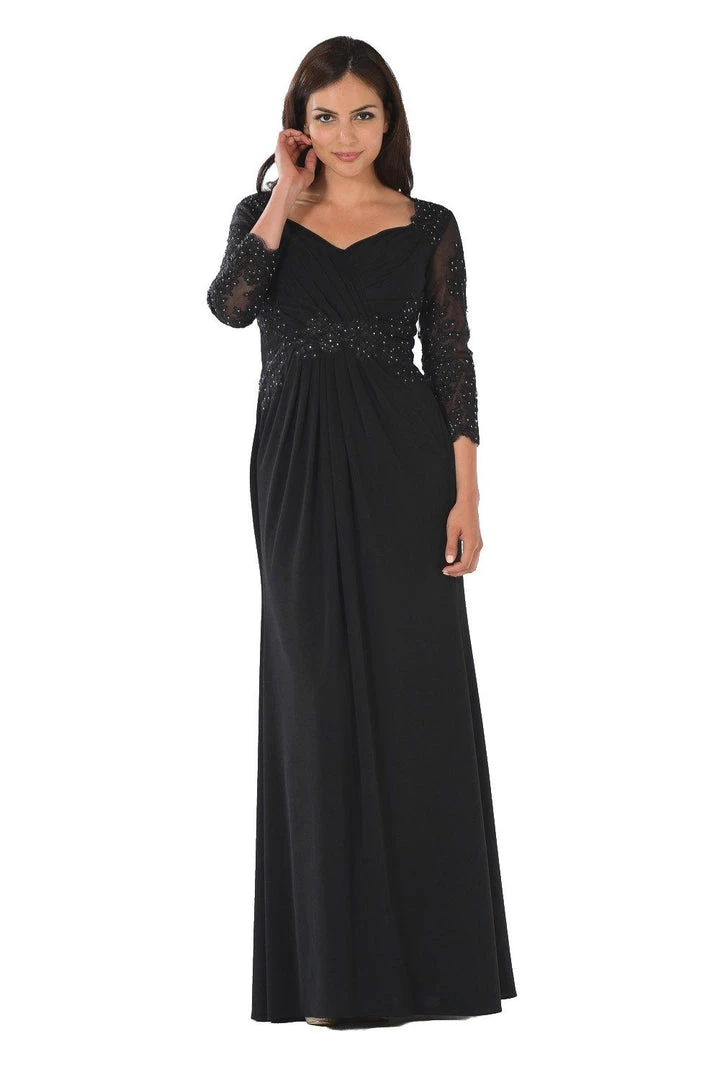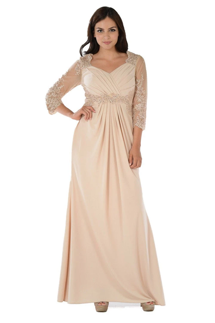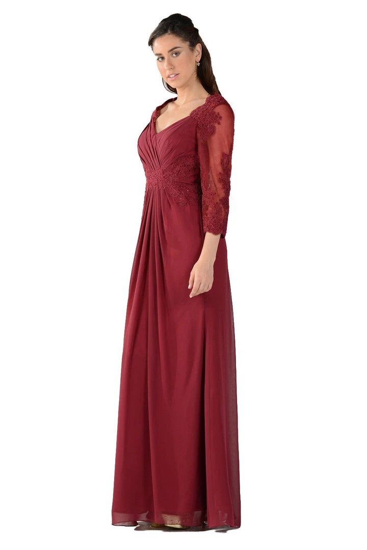 Look chic yet modest in this lace appliqued gown with sheer mid-sleeves by Poly USA 7812. This long evening dress features a pleated V-neck bodice that’s adorned with lace appliques and sheer mid-sleeves. An eye-catching embellished sheer back, a full-length skirt, and a zipper closure complete this beautiful look. Perfect as a mother of the bride dress or for any formal event!