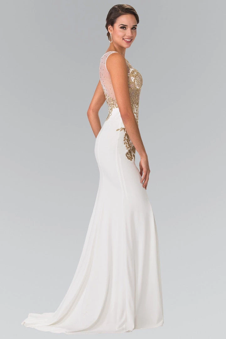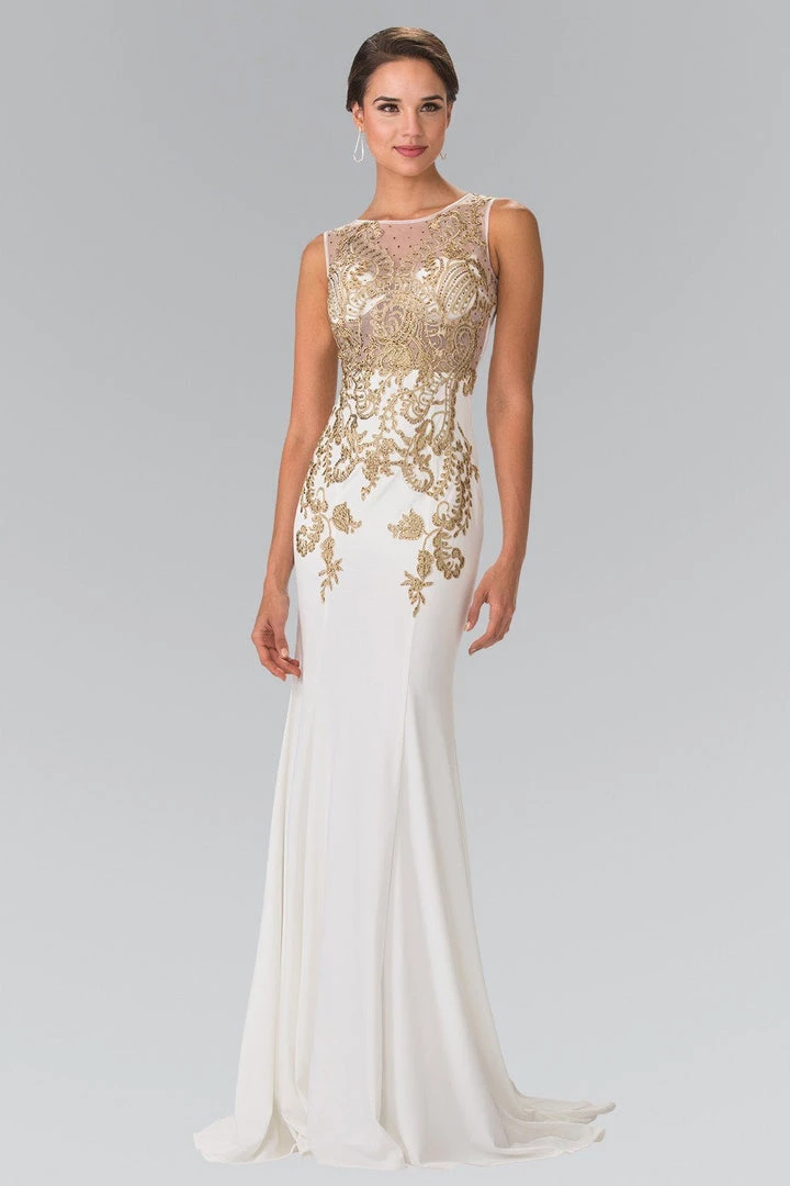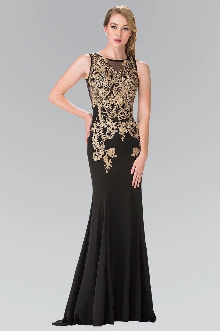 Fall in love with this long sleeveless lace appliqued dress with sheer bodice by Elizabeth K.