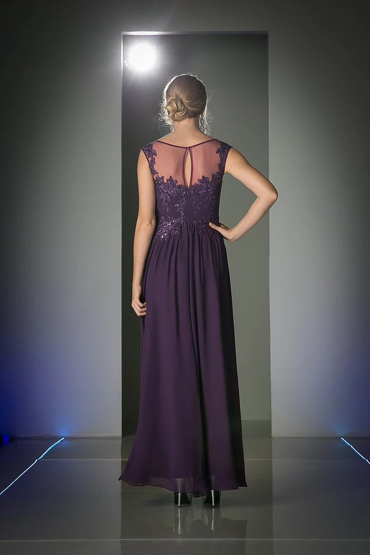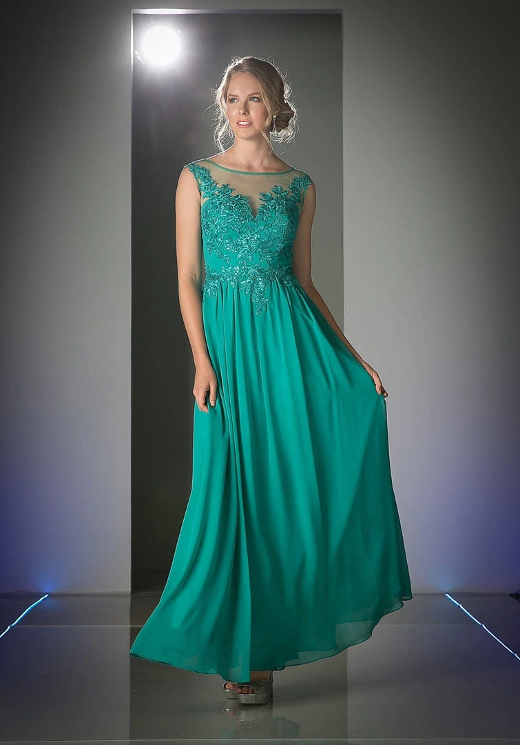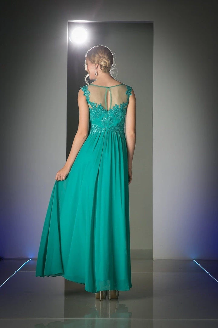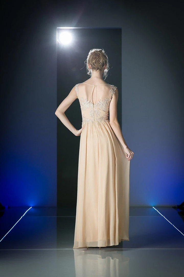 Fall in love with this illusion scoop neck evening dress by Cinderella Divine CF005. Floral design embroidery details the bodice atop a light weight floor length A-line chiffon skirt.