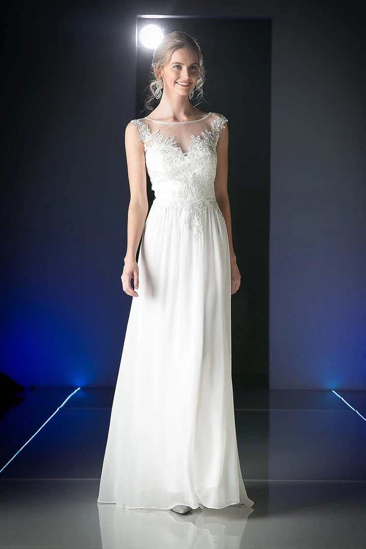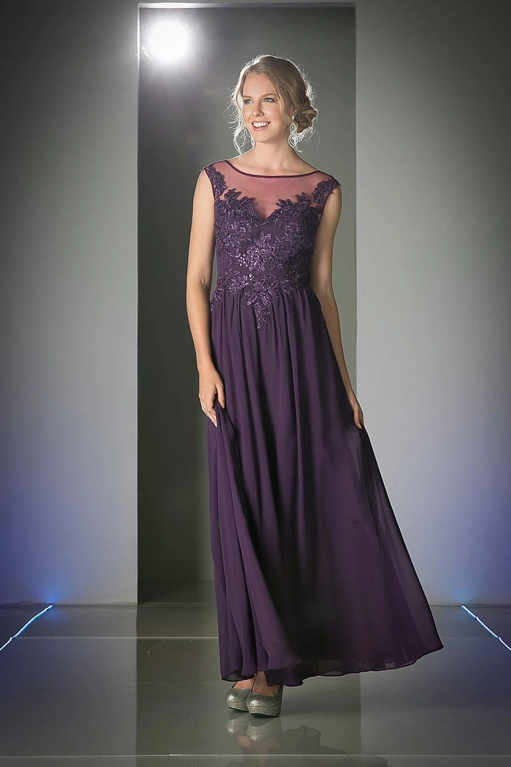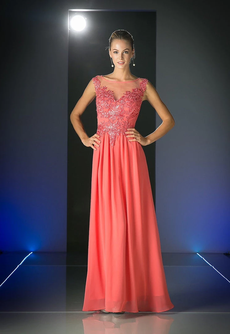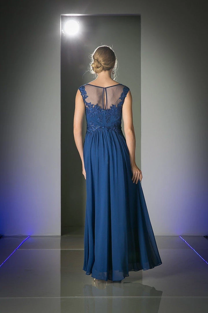 Fall in love with this illusion scoop neck evening dress by Cinderella Divine CF005. Floral design embroidery details the bodice atop a light weight floor length A-line chiffon skirt.