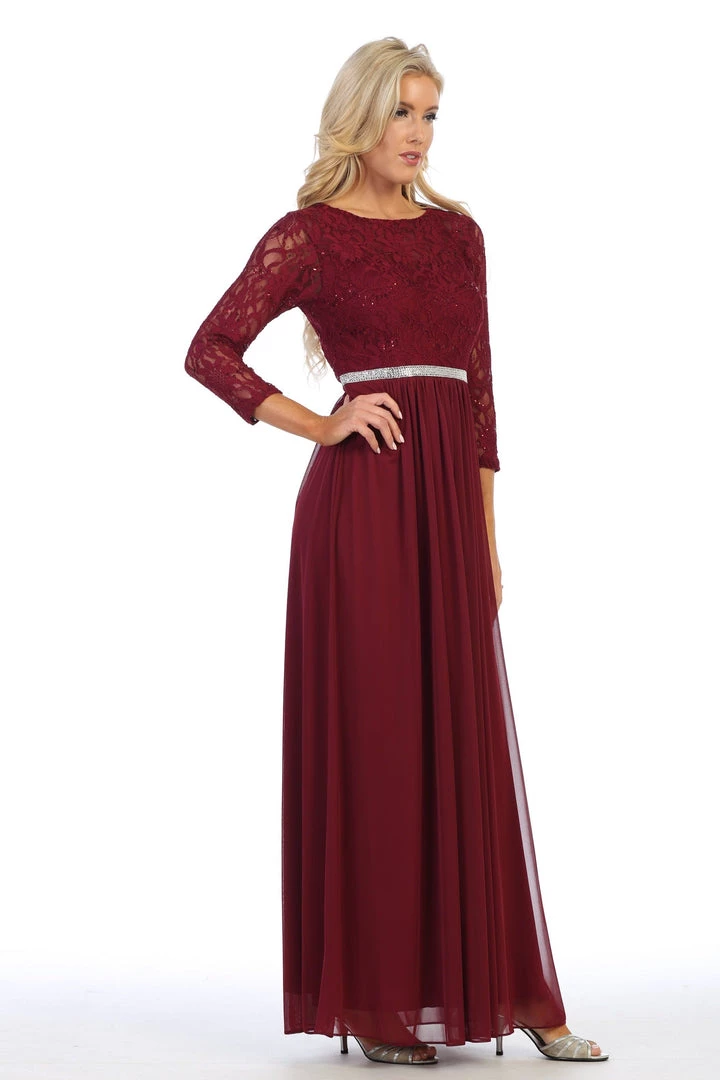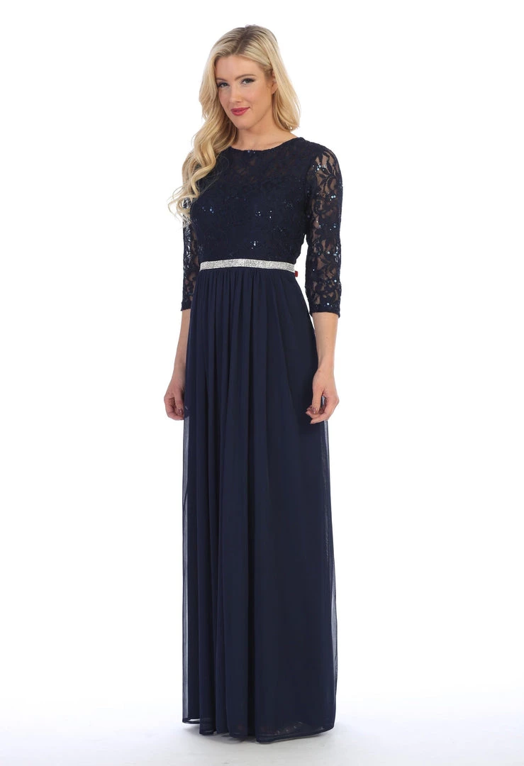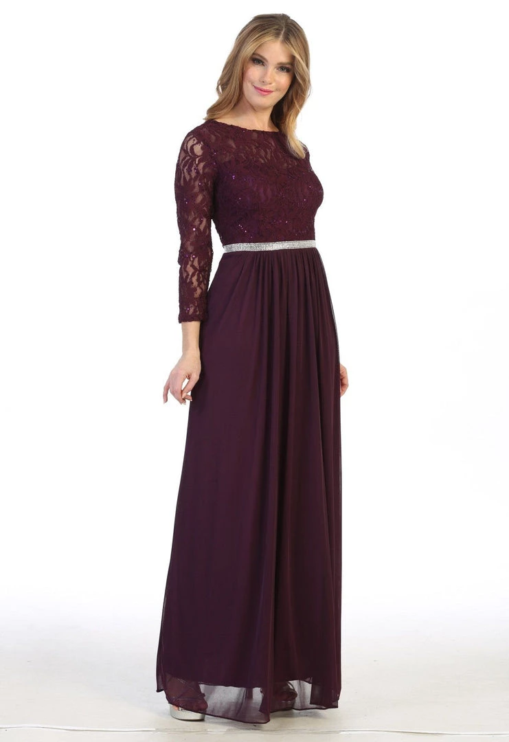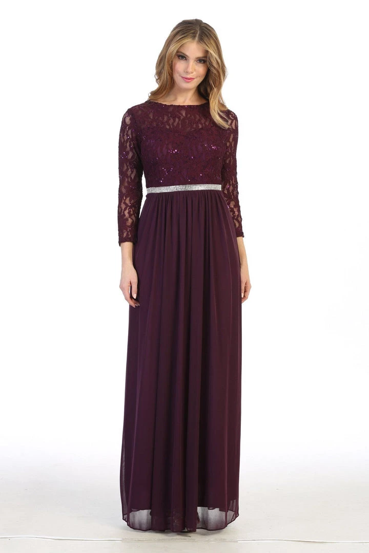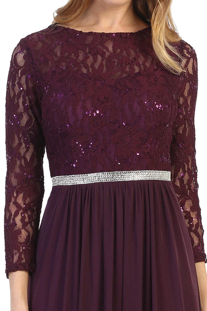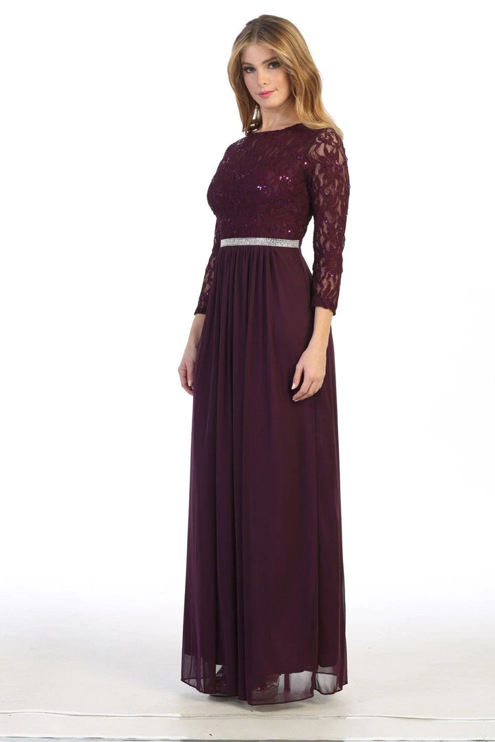 Captivate the room in this long-sleeved evening dress with lace bodice by Celavie 6305L. This beautiful formal gown features a sheer sequined lace bodice with long three-quarter length sleeves, sparkly waistline adorned with rhinestones, floor length chiffon A-line skirt, and a zipper closure. Affordably priced at $149, this long evening dress is perfect for any formal event and will keep you on budget!