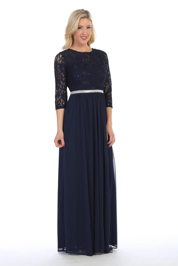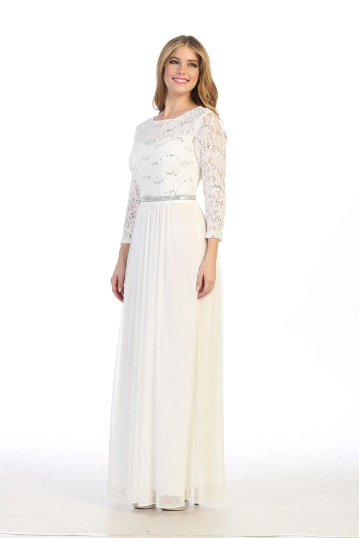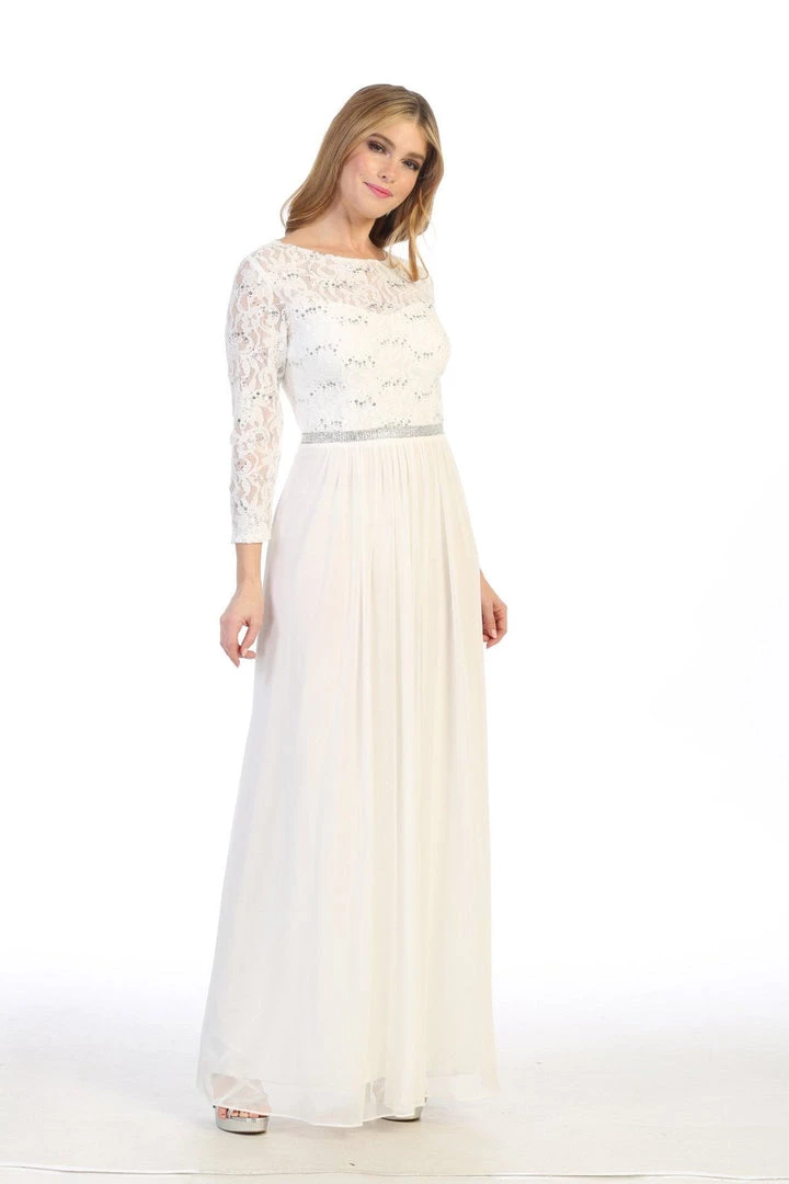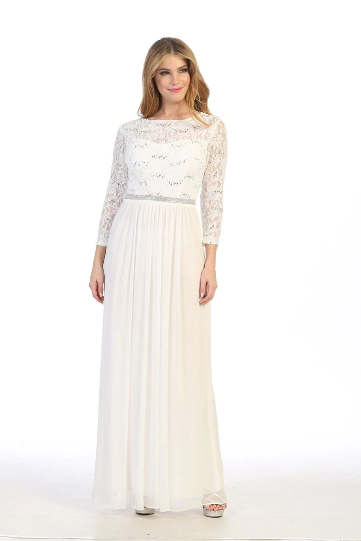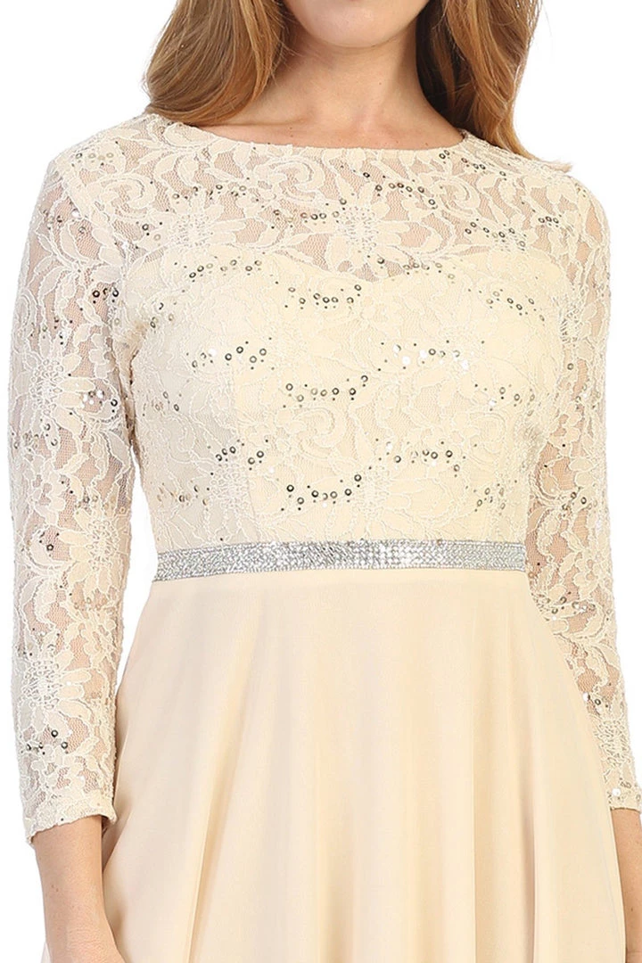 Captivate the room in this long-sleeved evening dress with lace bodice by Celavie 6305L. This beautiful formal gown features a sheer sequined lace bodice with long three-quarter length sleeves, sparkly waistline adorned with rhinestones, floor length chiffon A-line skirt, and a zipper closure. Affordably priced at $149, this long evening dress is perfect for any formal event and will keep you on budget!